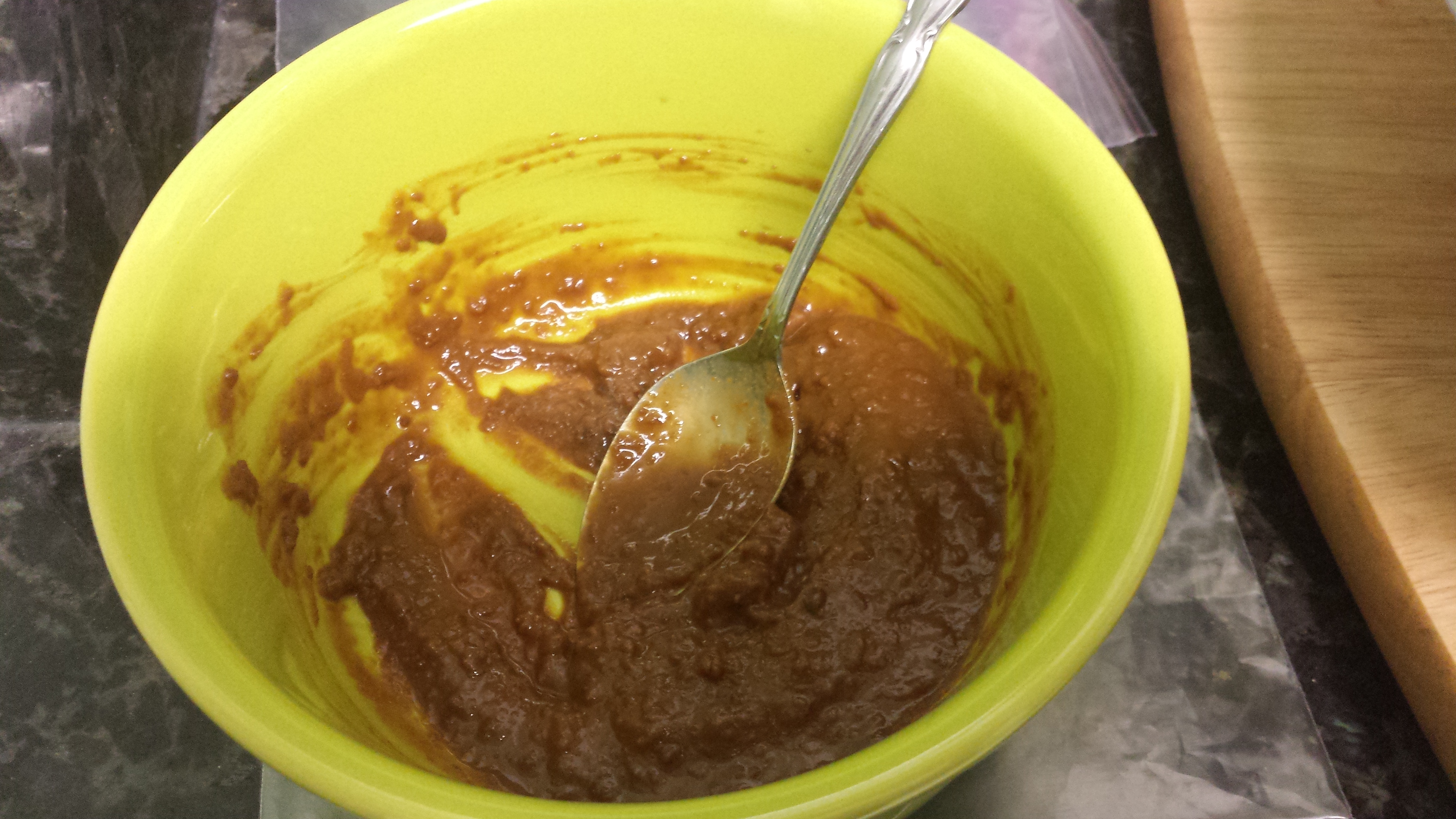 First, mix together the miso paste, mirin, and cooking sake in a bowl. You will need to mash the miso to get the chunks out.