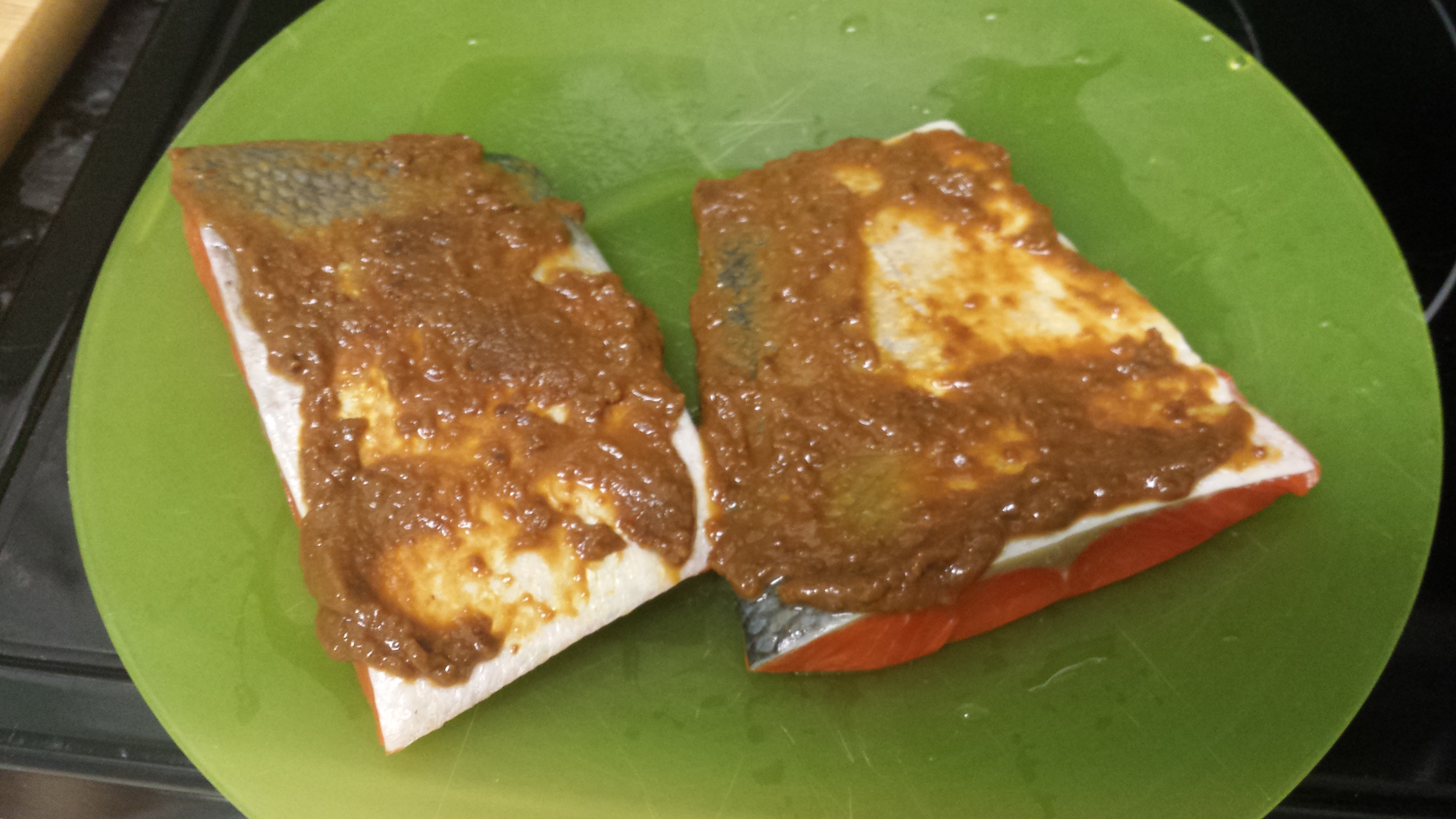 Next, slather your salmon in the miso on both sides. Make sure to use all of the miso paste (This recipe is enough for 2 salmon fillets. If you have more, increase the recipe as needed.) Marinade the fish for at least 10 minutes (no more than 1 hour or it will be too salty).