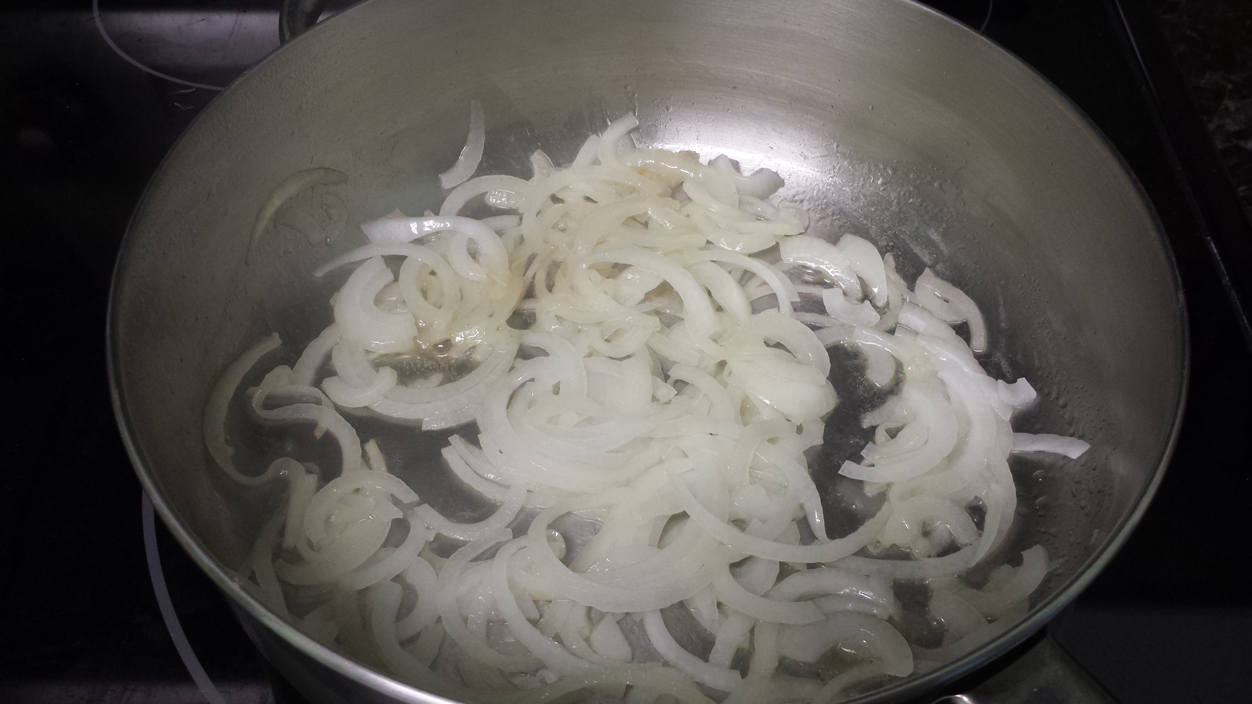 Cut your onion thinly. You can dice it or slice it, either is fine so whatever your preference is. I happen to like sliced onion, so these are sliced up and about 1/8 inch thick. Heat a saute pan at medium-high heat (around 7/8 on a scale of 1-10) and add the butter. When the butter has melted and is bubbling, add the onions. Saute the onions until translucent, about 5 minutes.