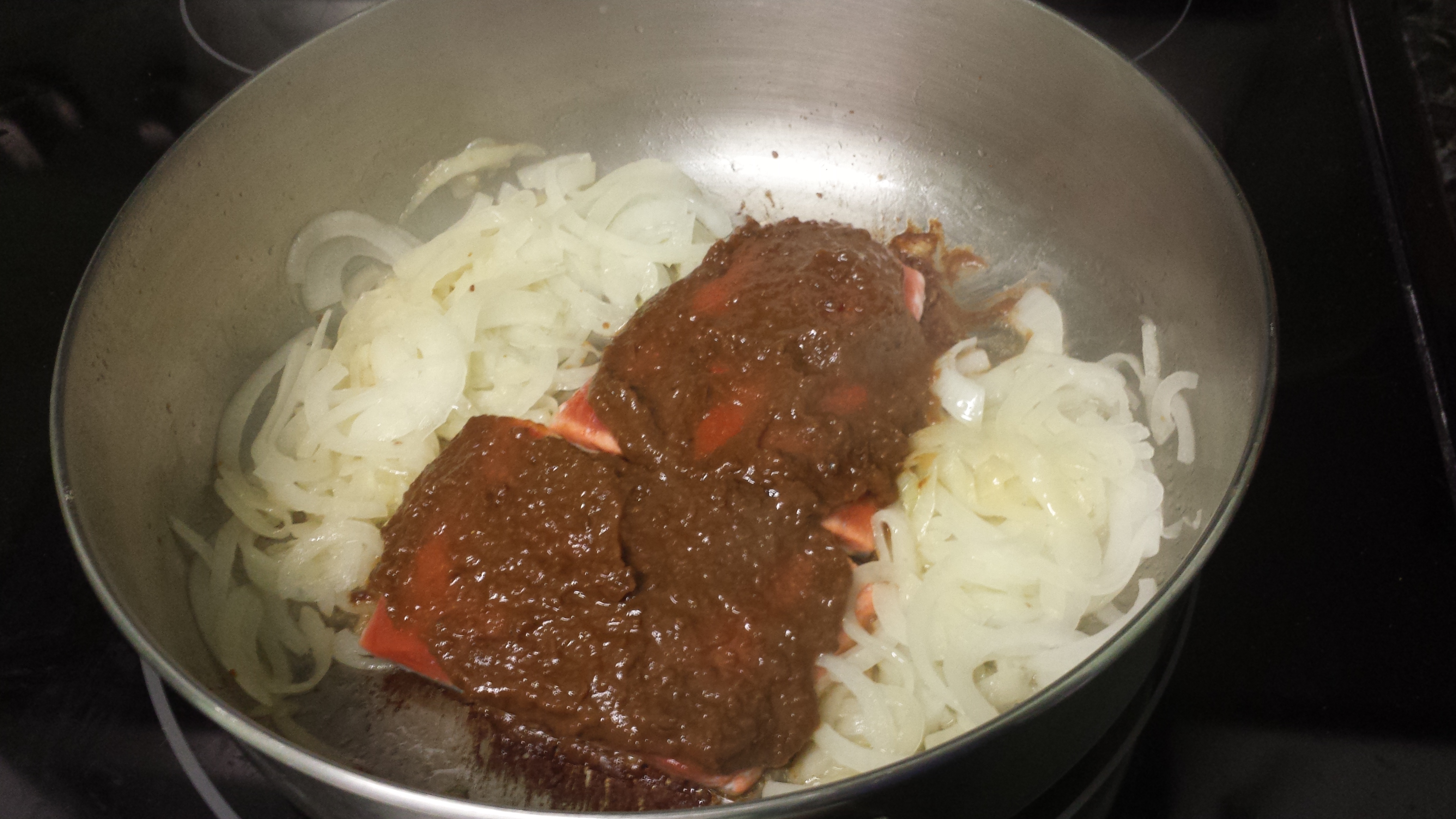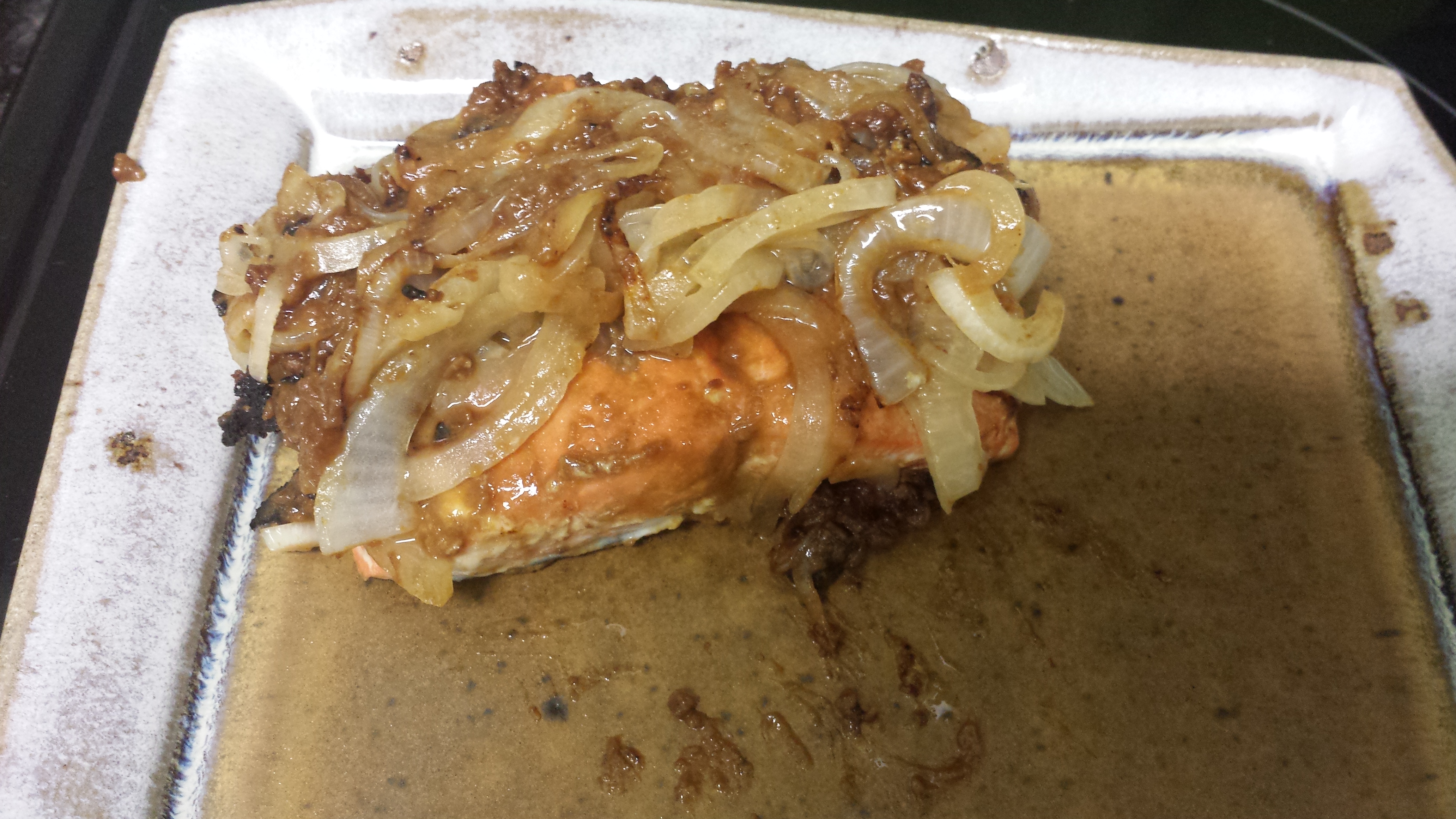 When the salmon has finished cooking, remove it from the pan and place it on a plate to rest for 5-10 minutes. Don’t remove the onions from the pan yet. While your fish is resting, turn off the stove and stir the onions in the left-over miso. When your fish is ready, put it on a plate and layer the onions on top. Enjoy!