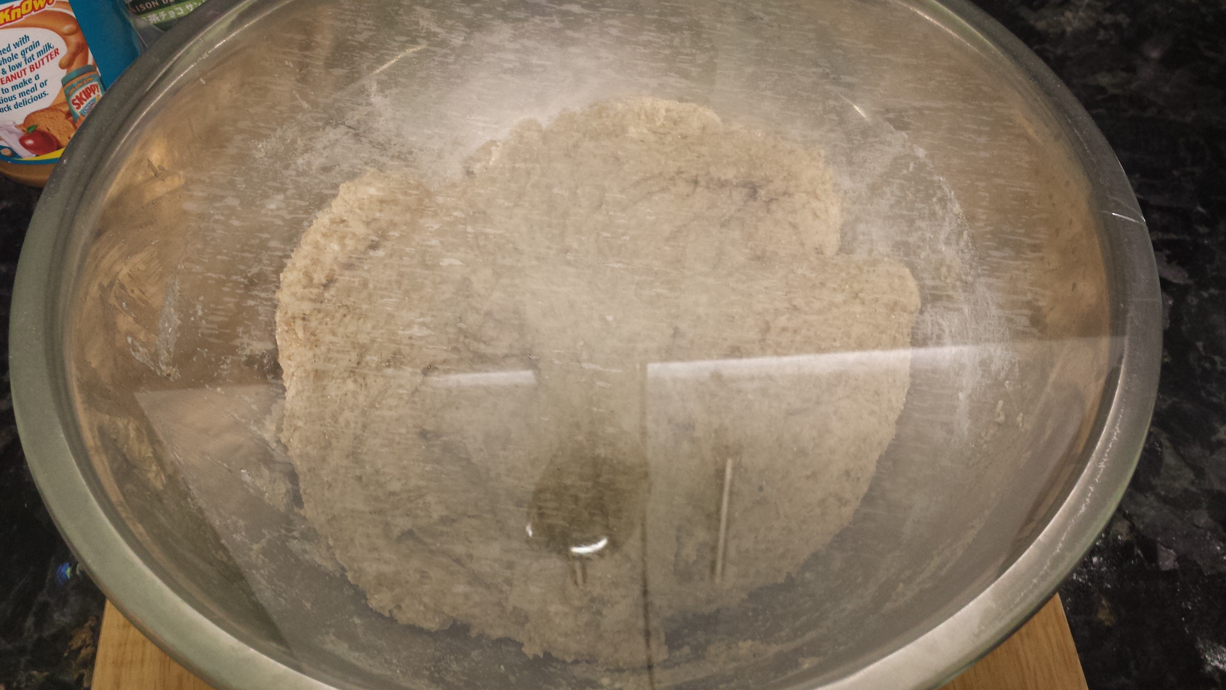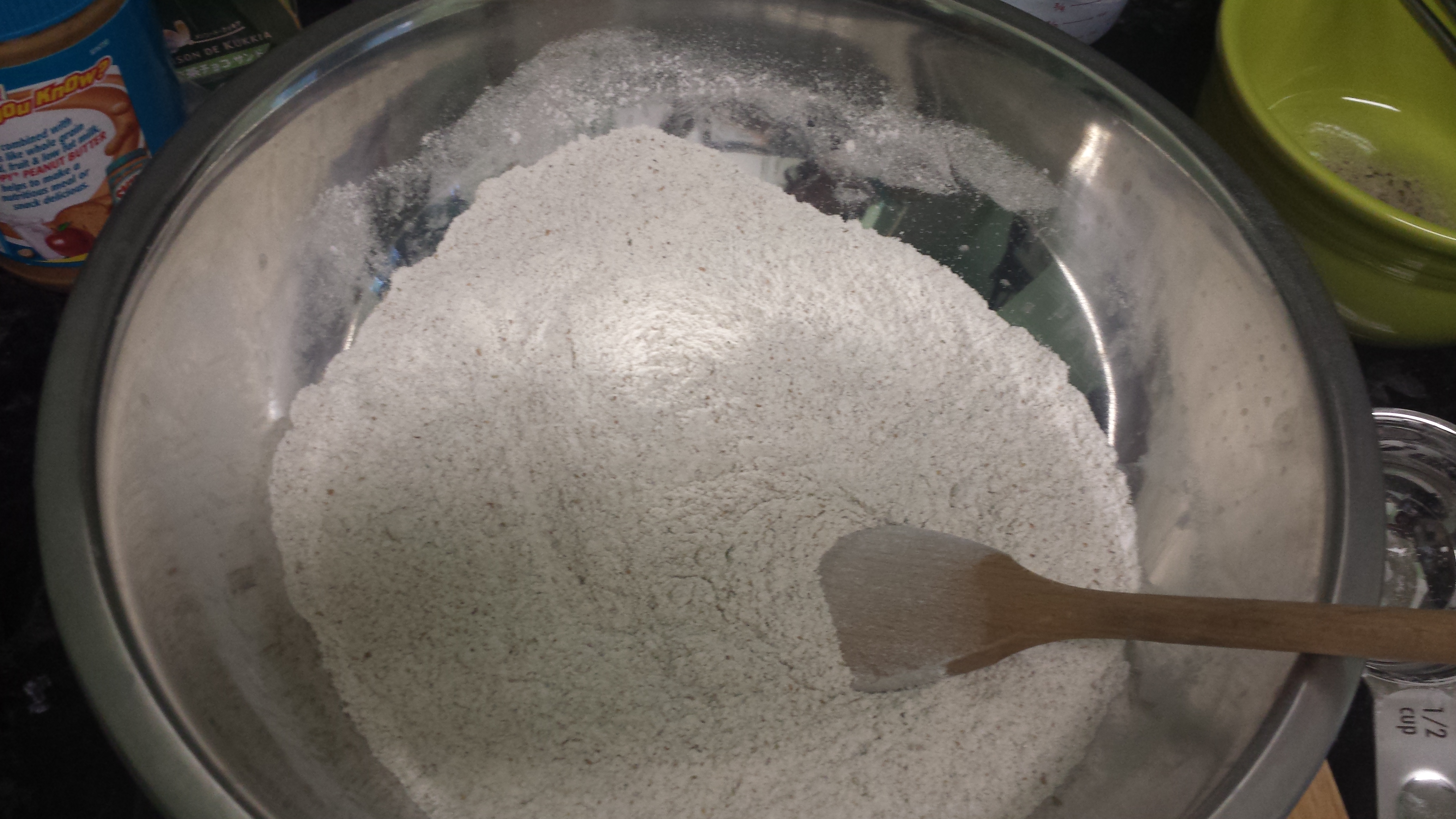 Mix together all the dry ingredients in a large bowl (You will use the same bowl for rising, so it should be big enough for the dough to double)