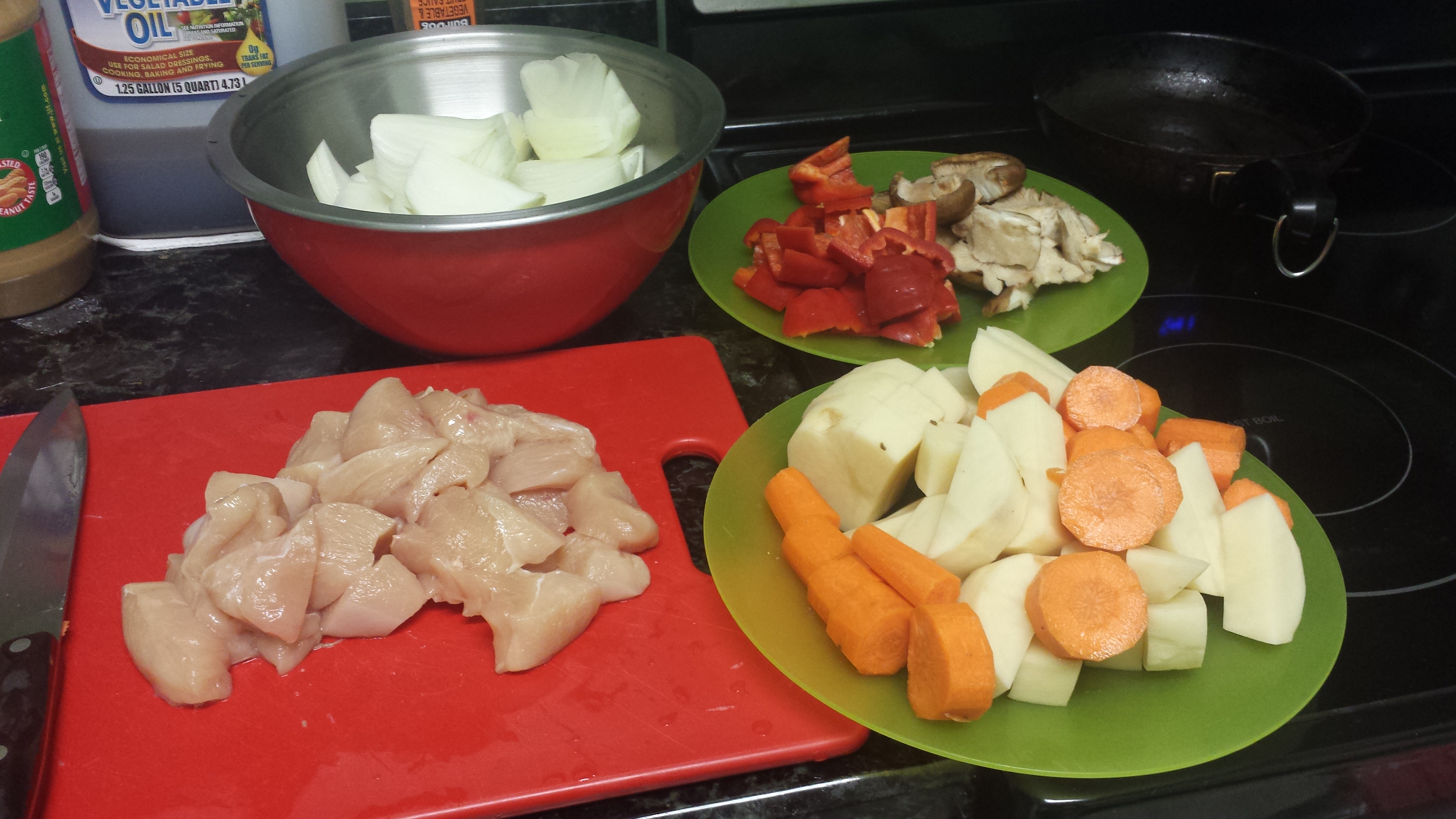 To start your curry, cut your ingredients up into bit-sized pieces, like below. Try to make the pieces of carrot and potato similar sized so they cook at the same time.