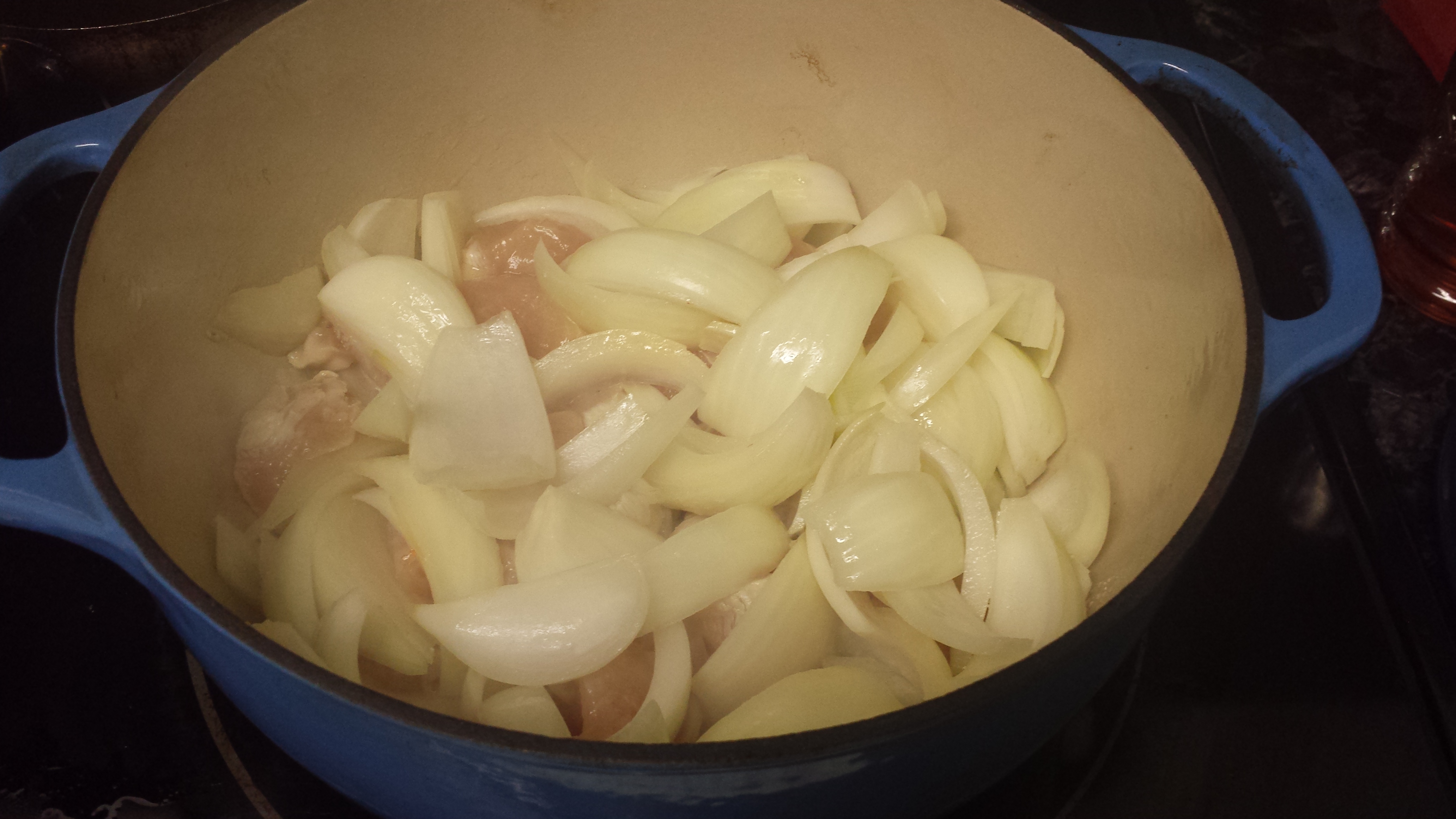 Your first task is to brown your meat and onions, so the next step will vary depending on what kind of pot/pan you decide to use. I like to use my dutch oven for curry, so I can make the whole recipe in this one pot. With the dutch oven, I just throw some oil in the bottom (about 1 TBSP), heat it up, and brown the onions and chicken directly in the pot. Cook the meat and onions until the onions turn translucent, about 10 minutes.