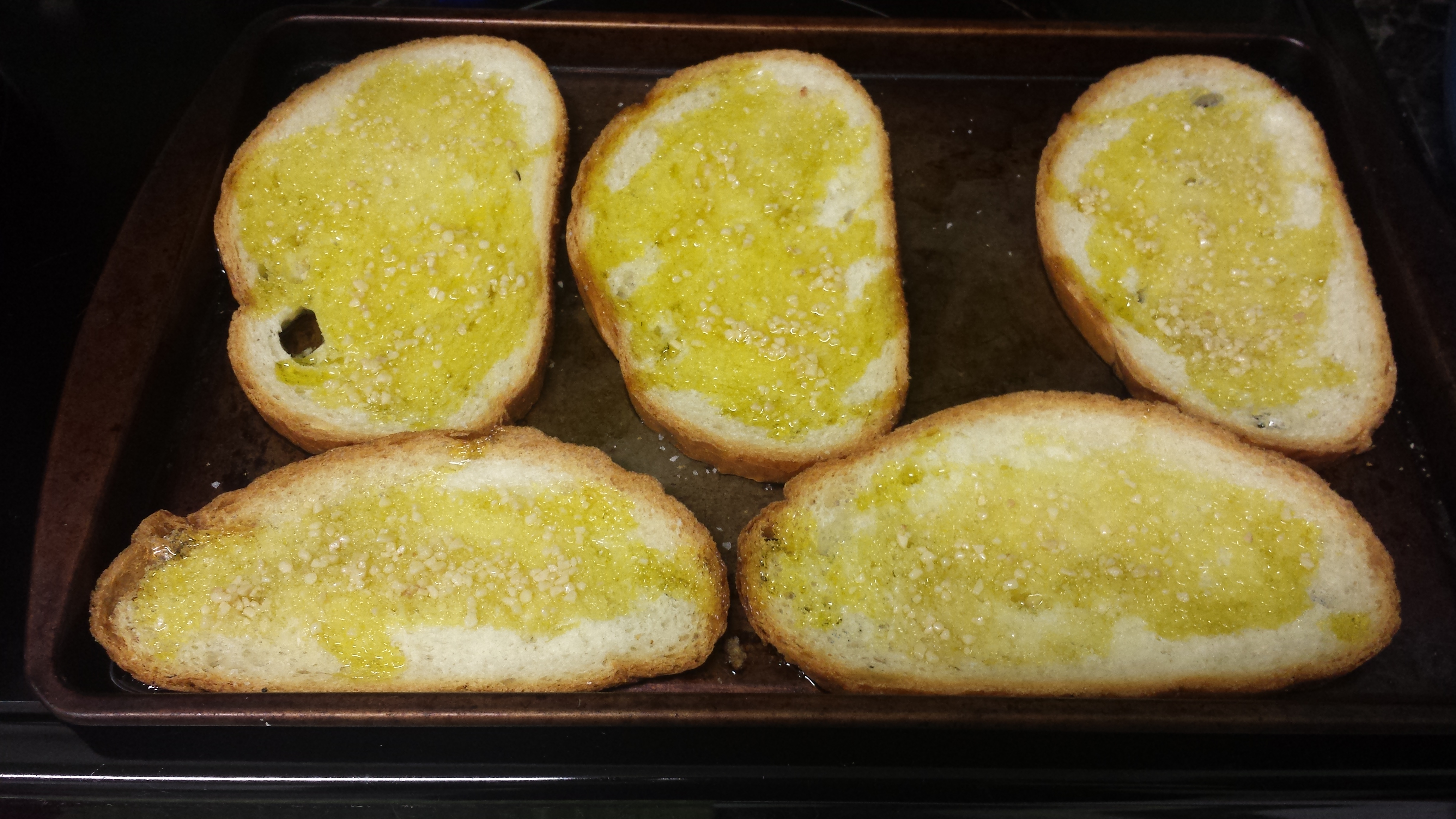 Drizzle with olive oil. If you have thick bread, you will want to go heavy on the olive oil. Otherwise, drizzle it like you might over roasted vegetables. There is not really much science to this, it’s more of a preference thing.