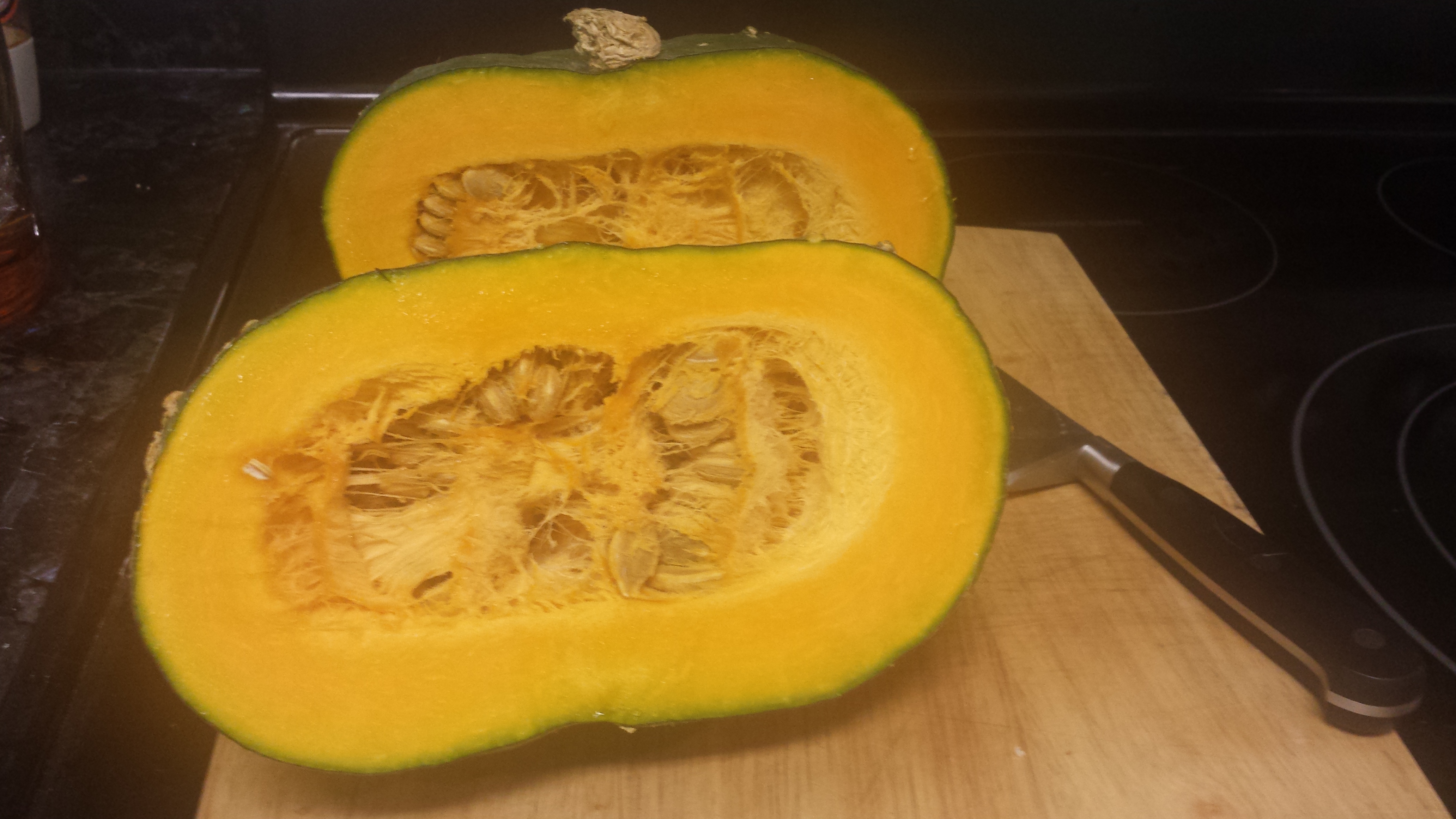 Start by cutting your Kabocha in half and removing all the seeds. I usually just scoop the seeds out with a spoon like I would for any other pumpkin or squash.
