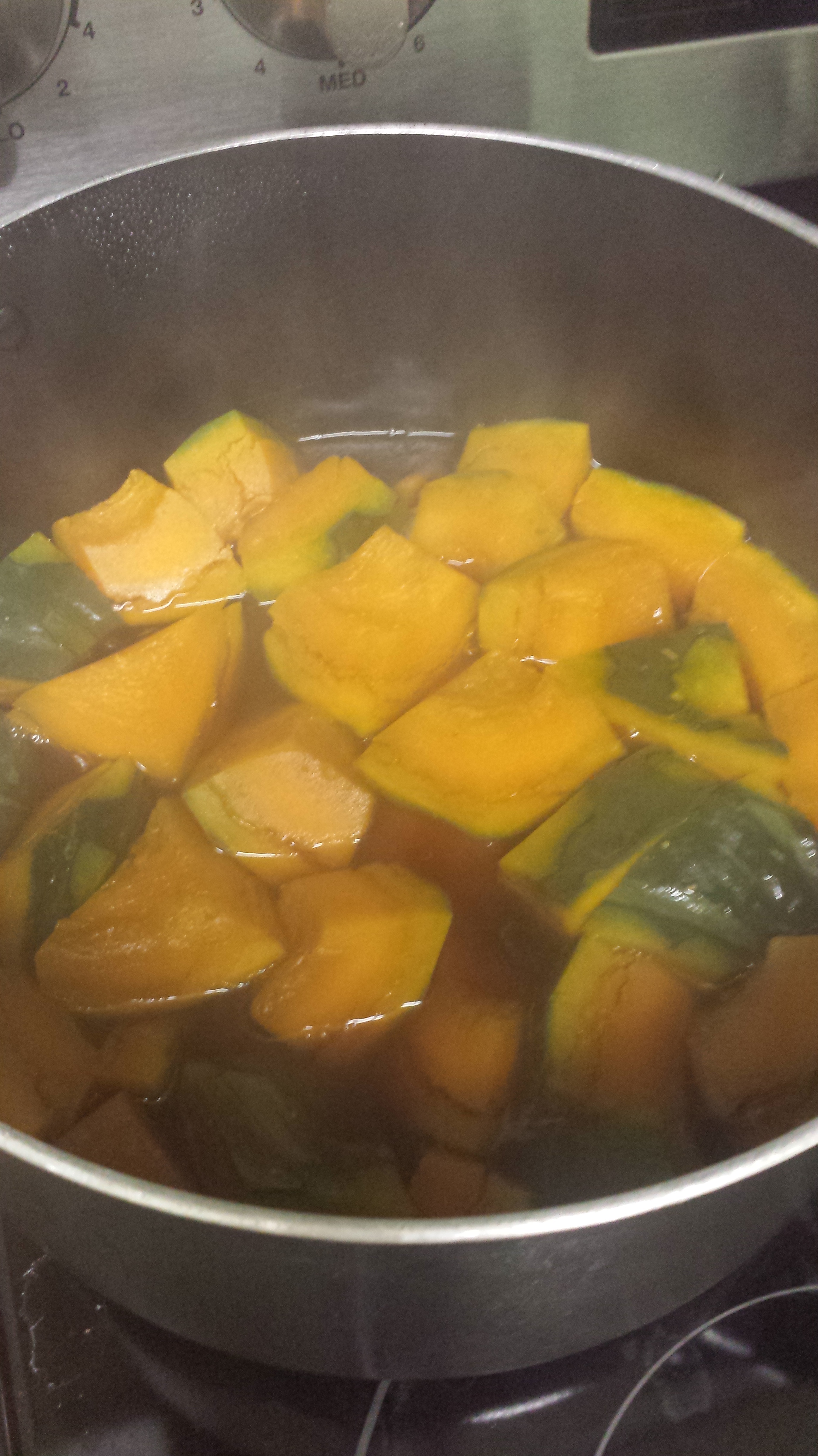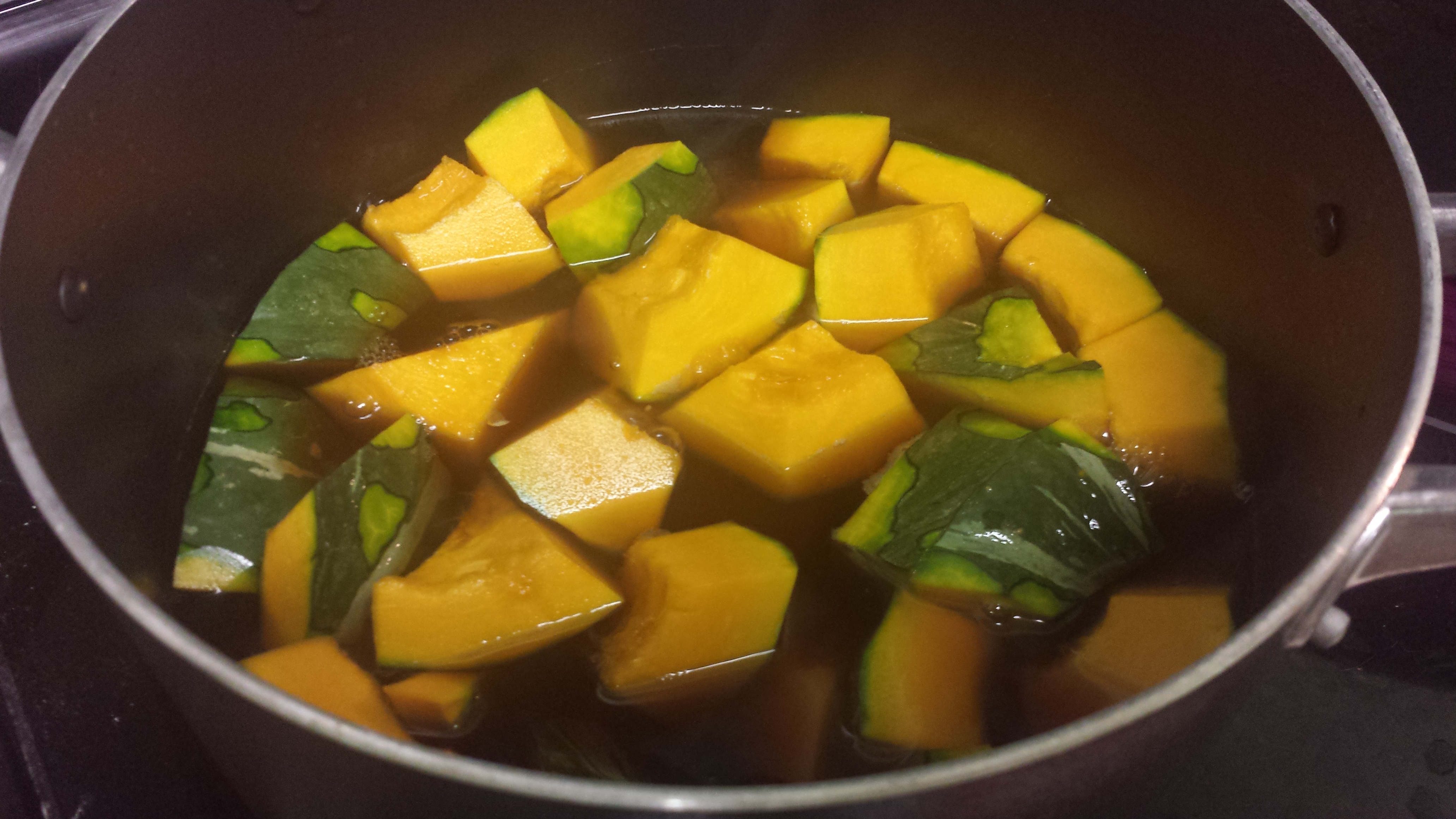 Once it boils, add the Kabocha to the pot and bring it back to a simmer. Set the burner to medium-low heat.
