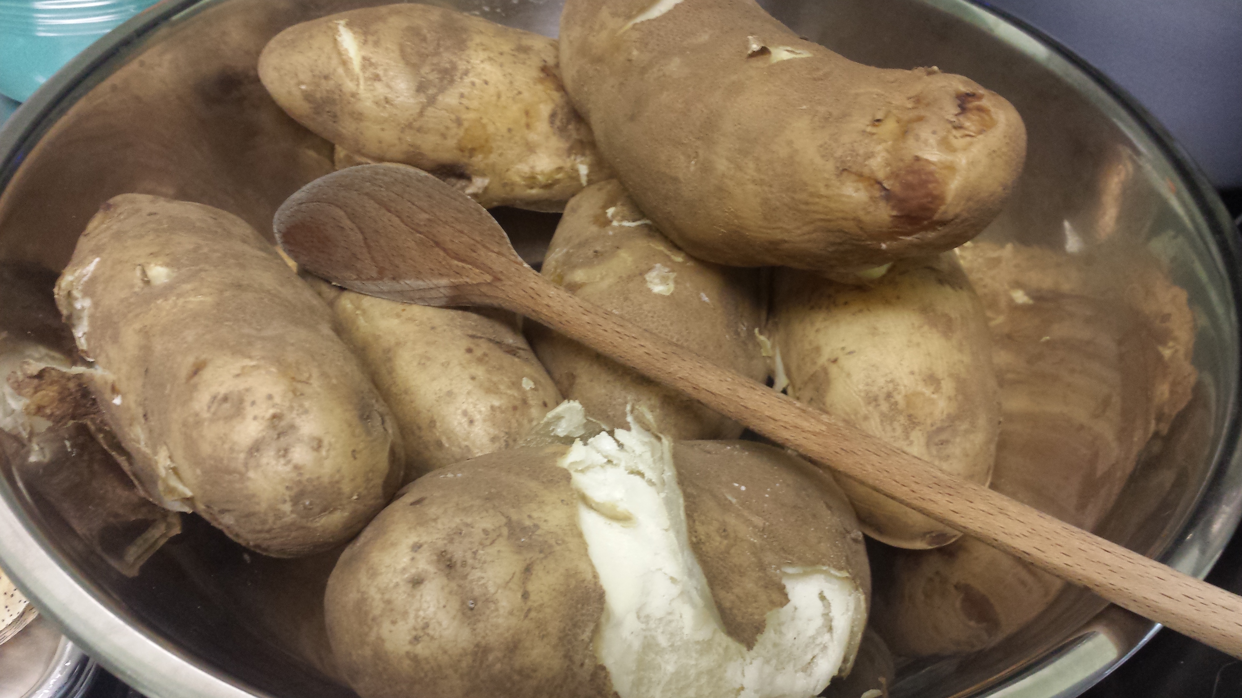 Boil a pot of water, then add your potatoes whole with skin on. I used russet potatoes this particular time, but my Oma says red potatoes are often the best. They hold together well and don’t get mushy. Costco didn’t have red potatoes, so I just got russet. Boil the potatoes until you can easily stick a fork through to the center.