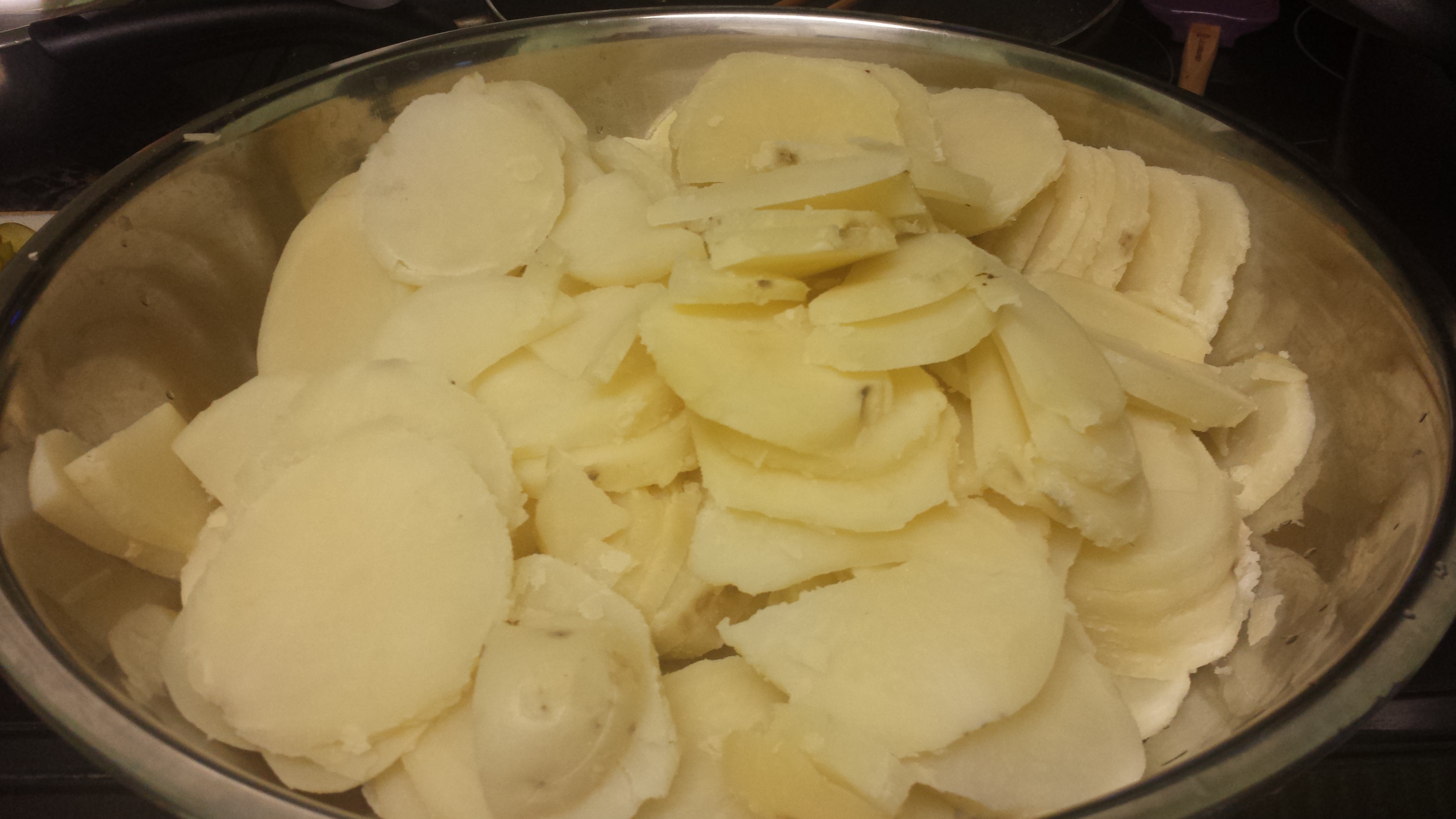 I appear to have totally forgotten to take a picture of the final product. Sincerely apologize for that! Honestly, it just looks like potatoes covered in oil, vinegar, pickles, and seeds. I’m hungry just thinking about it…