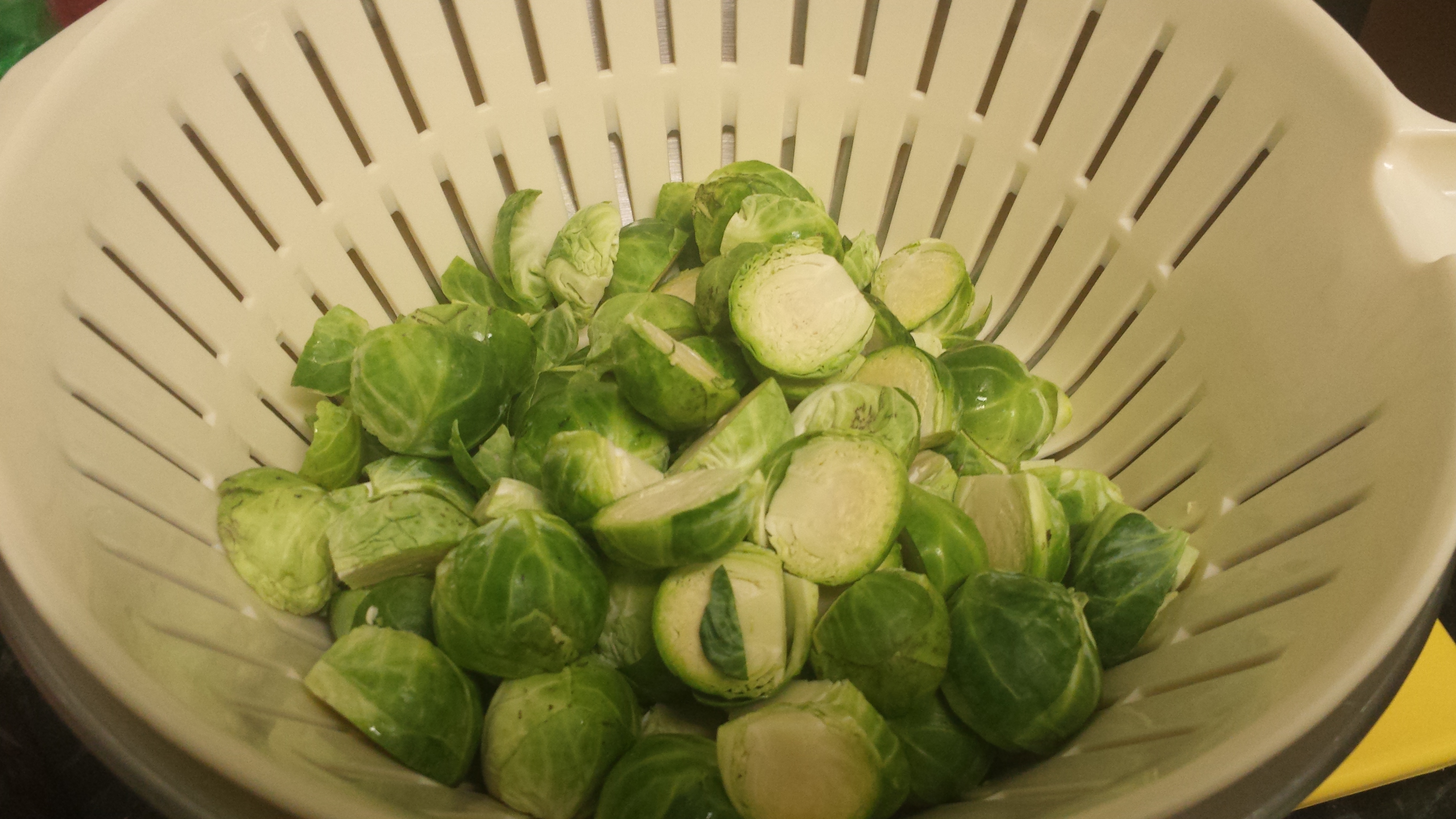 Preheat your oven to 400 degrees. Cut your brussel sprouts in half and wash thoroughly.
