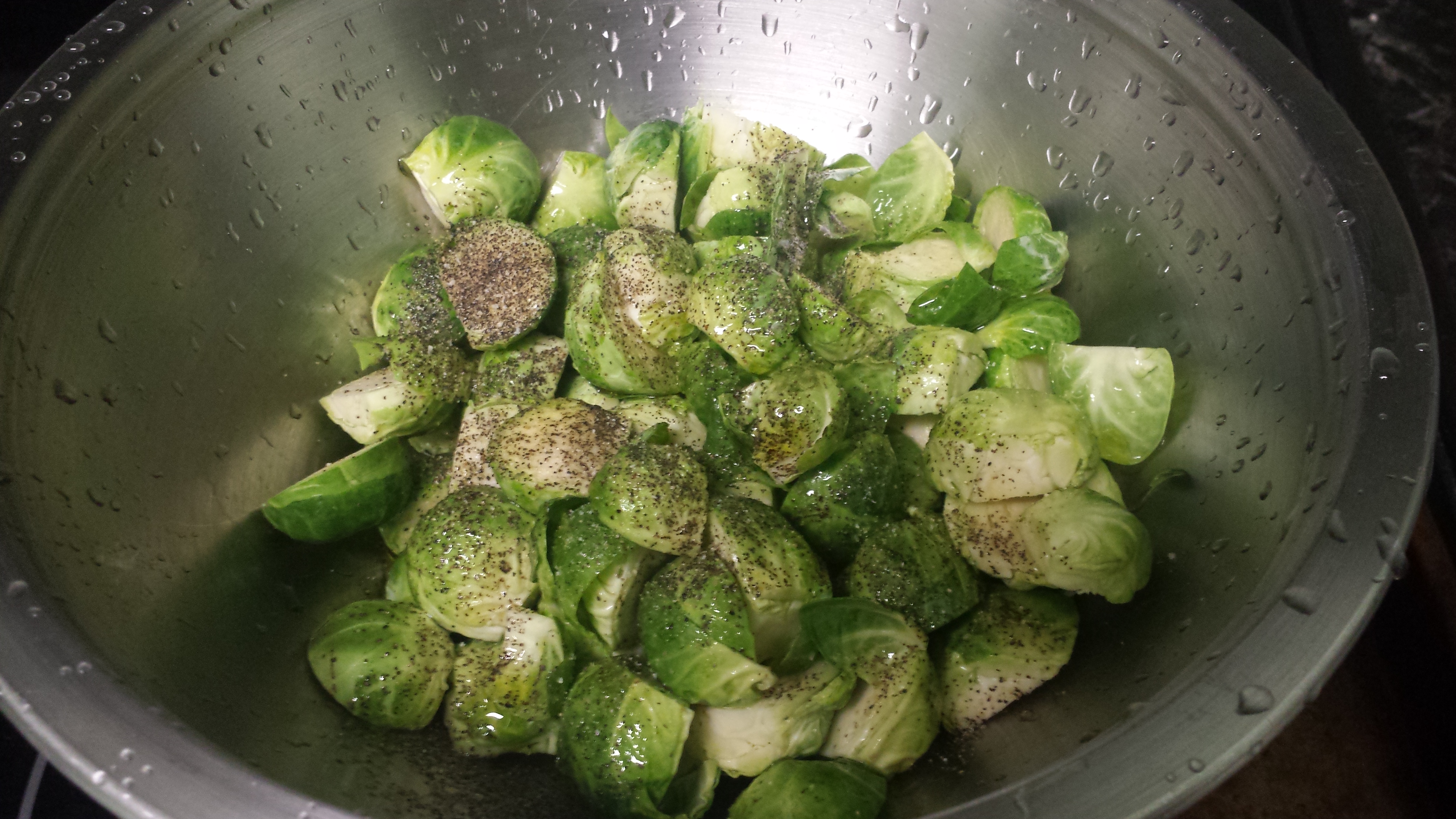 Put the brussel sprouts in a bowl and drizzle with olive oil, salt, and pepper to taste. I usually use about 2 tbsp olive oil, 1 tsp salt, and 1 tsp pepper (I like pepper) for 2 people. Mix well.