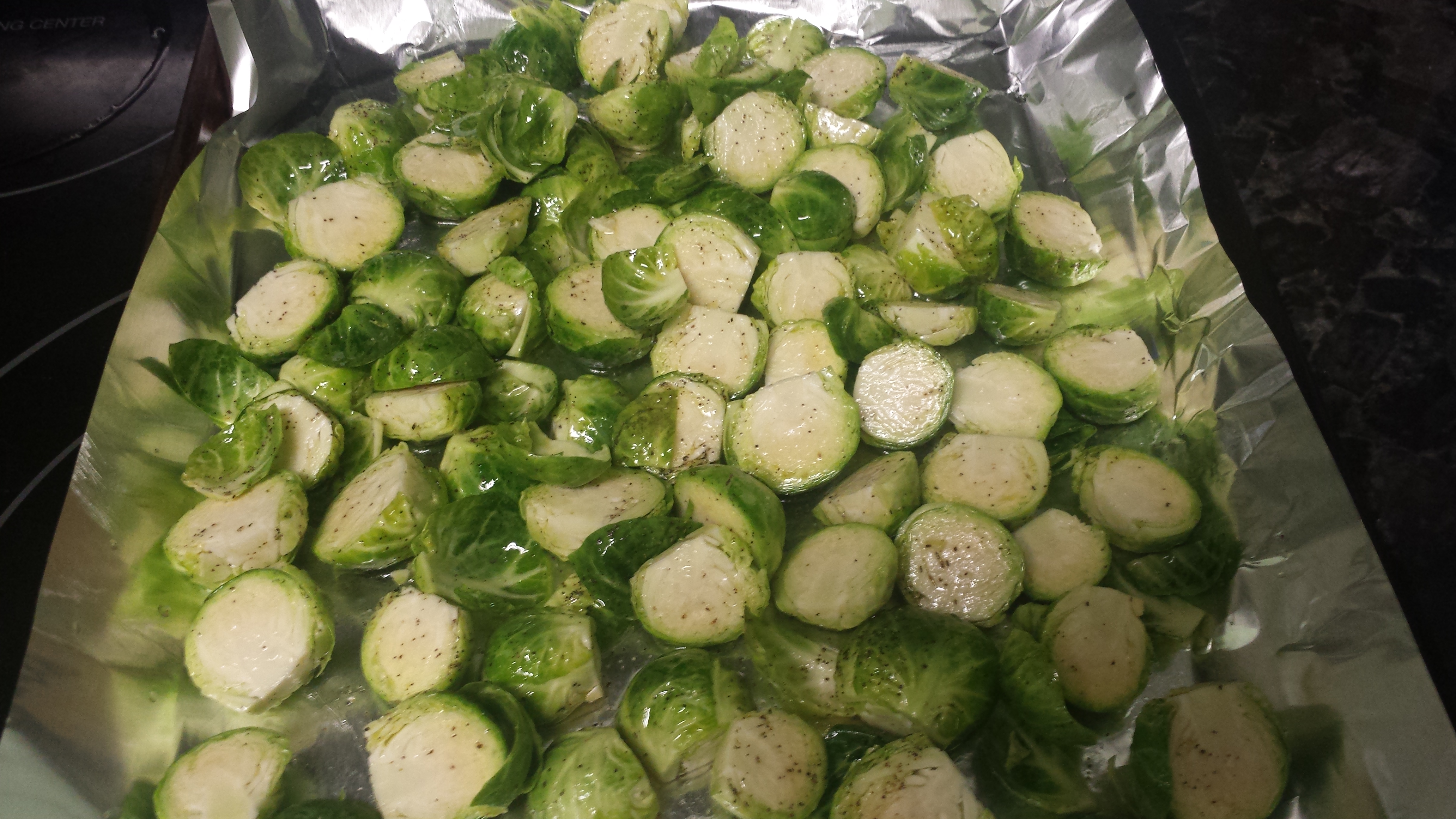 Spread the brussel sprouts on a pan. I use foil because it’s easier to clean, but you don’t need to do that. Make sure they are in a single layer or they won’t get crispy.