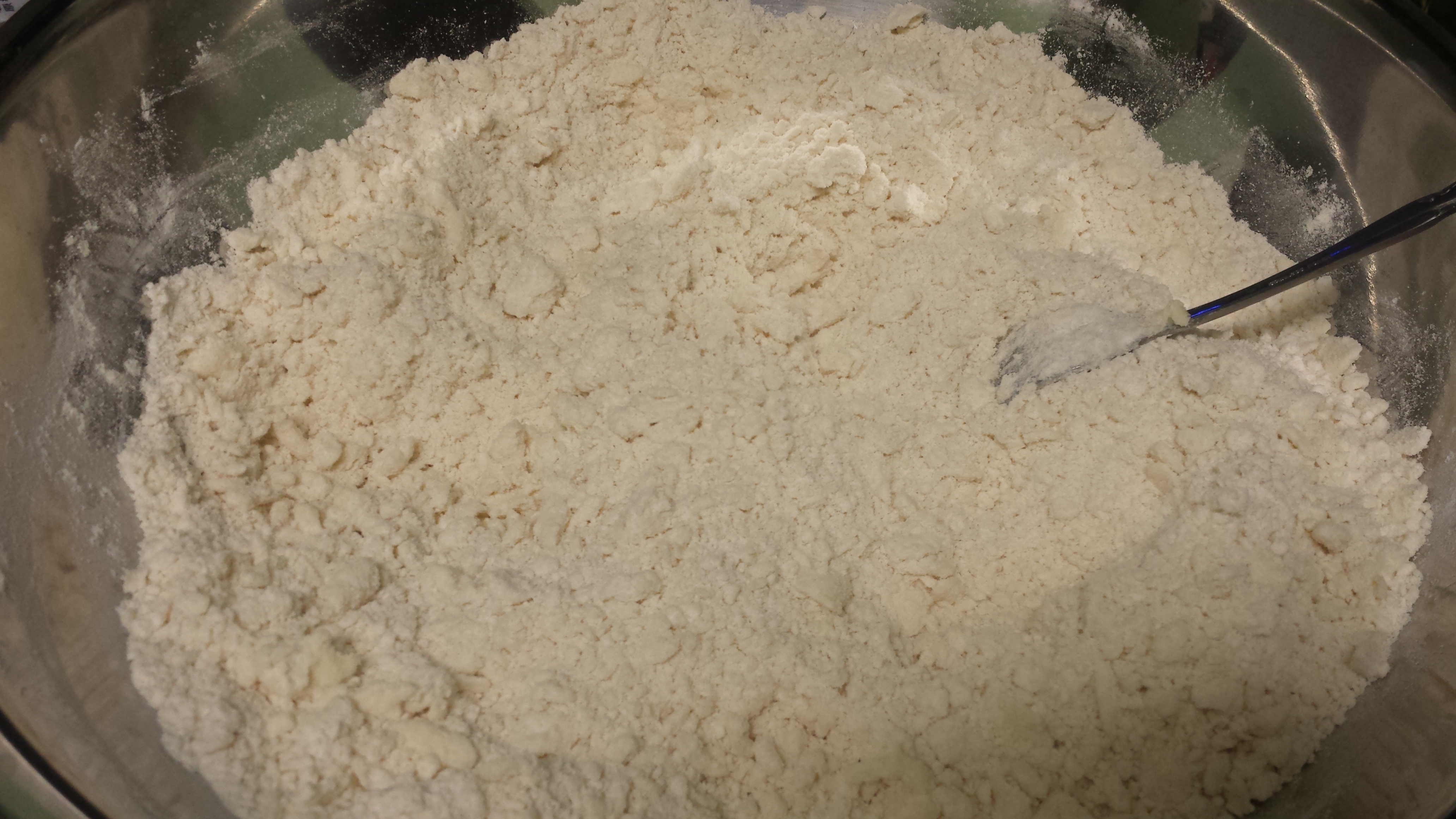 Continue this process until the dough looks like the image below. The butter has been well-incorporated, but it’s still pebbly and some clumps stick together to form larger clumps. As you can see, I switched from knives to a fork, I find a fork works best once the butter is cut into small chunks.