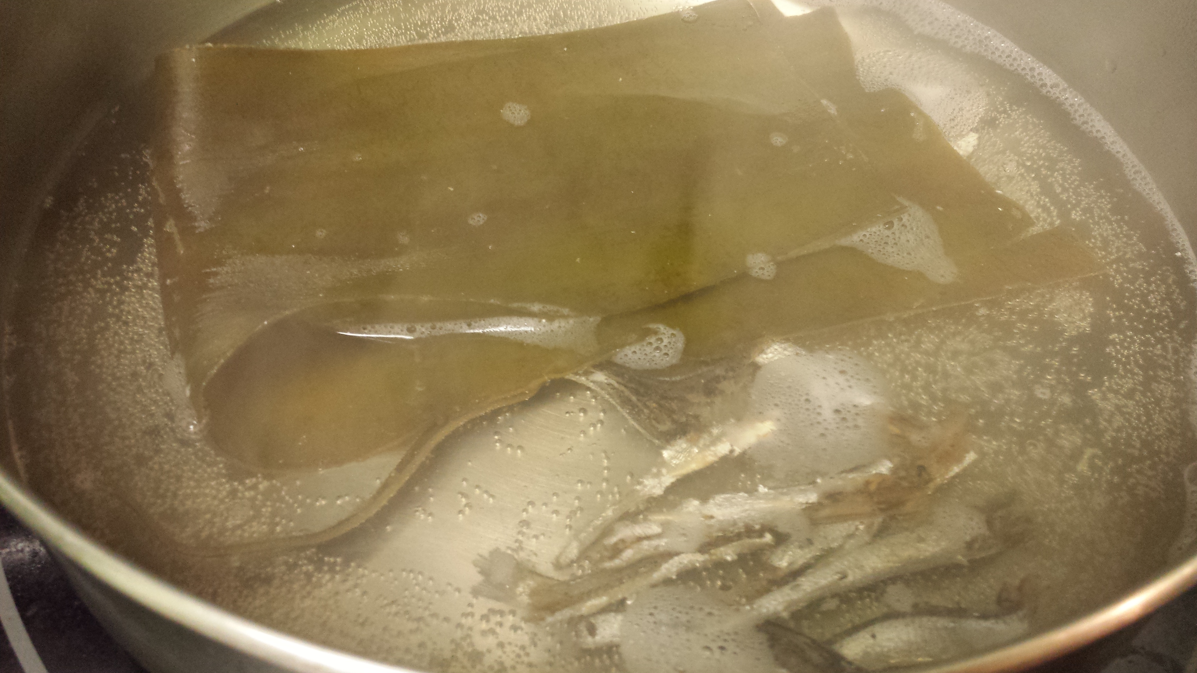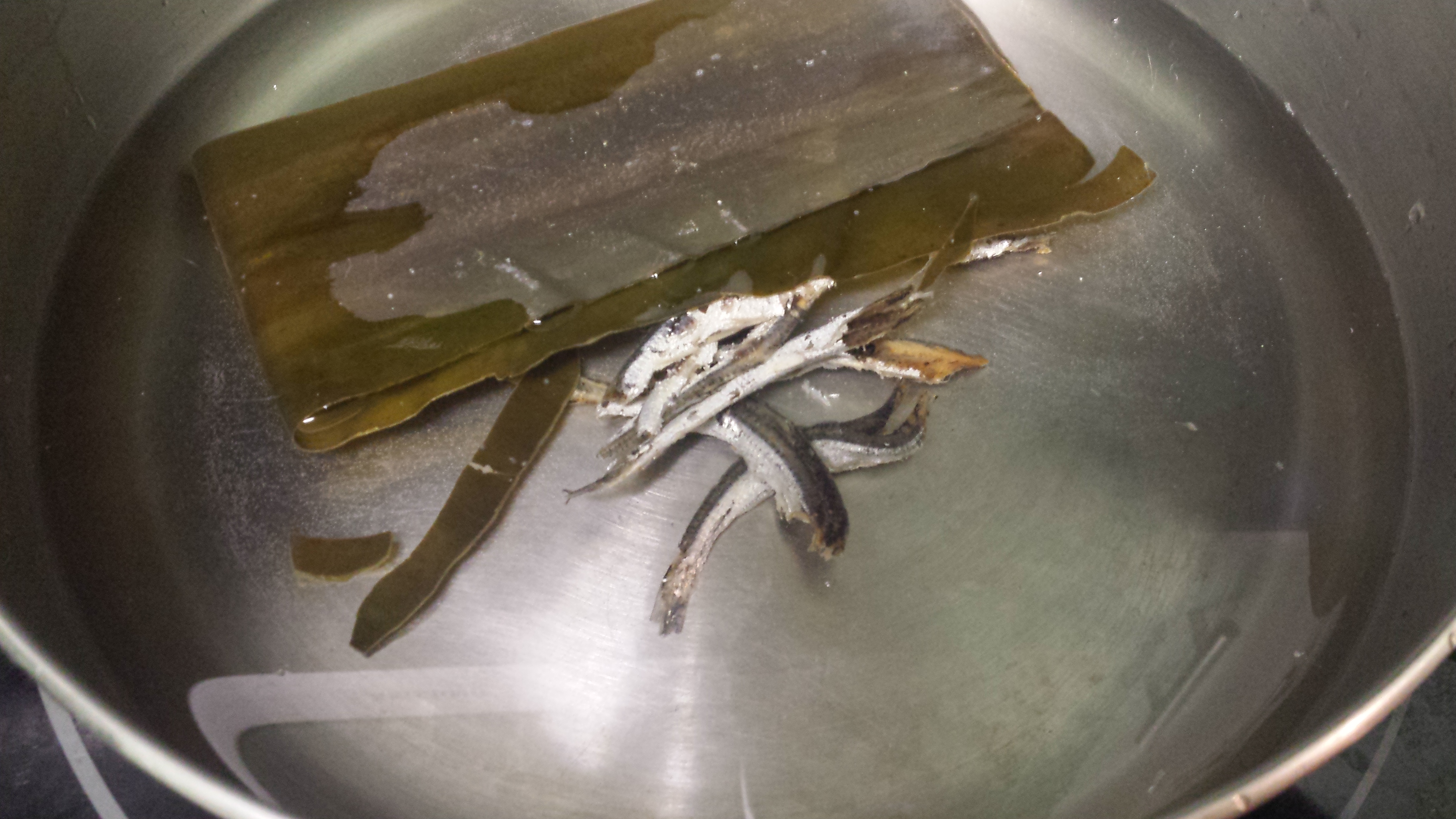 Boil the anchovies, kelp, and water in a shallow pan for 15 minutes over medium-high heat.