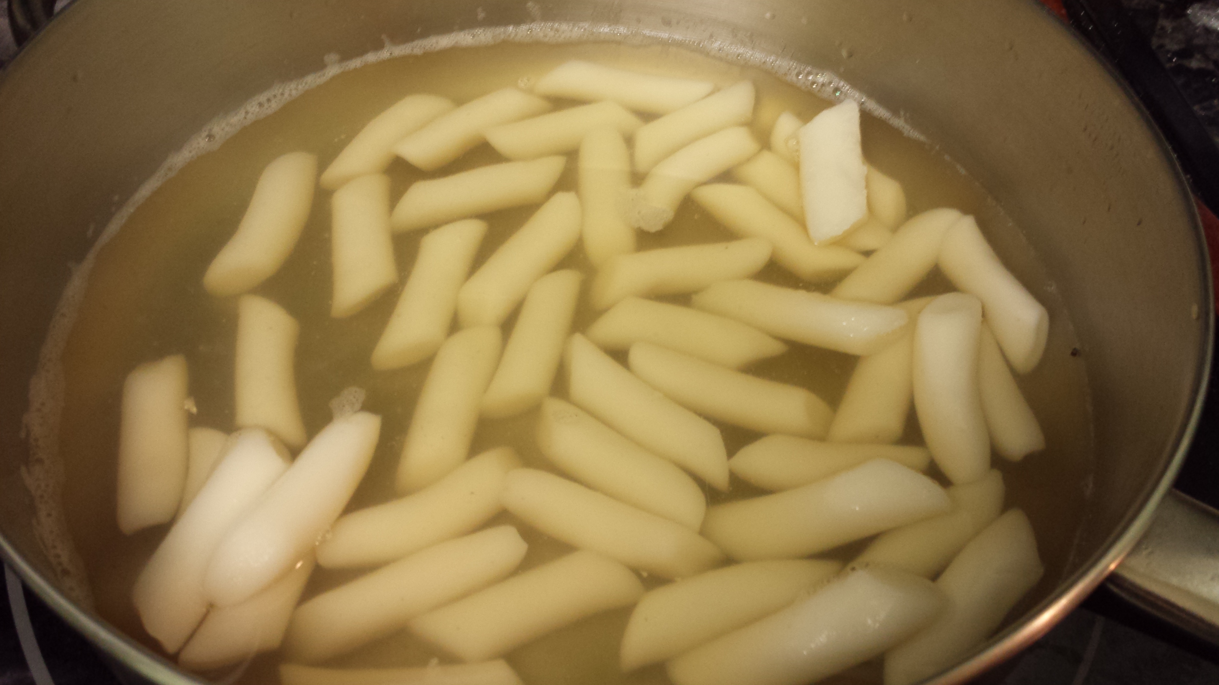 1 lb Korean rice cakes (these are different from Japanese rice cake; so if you are buying these at the grocery, look for tube-shaped rice cake with Korean on the package)
