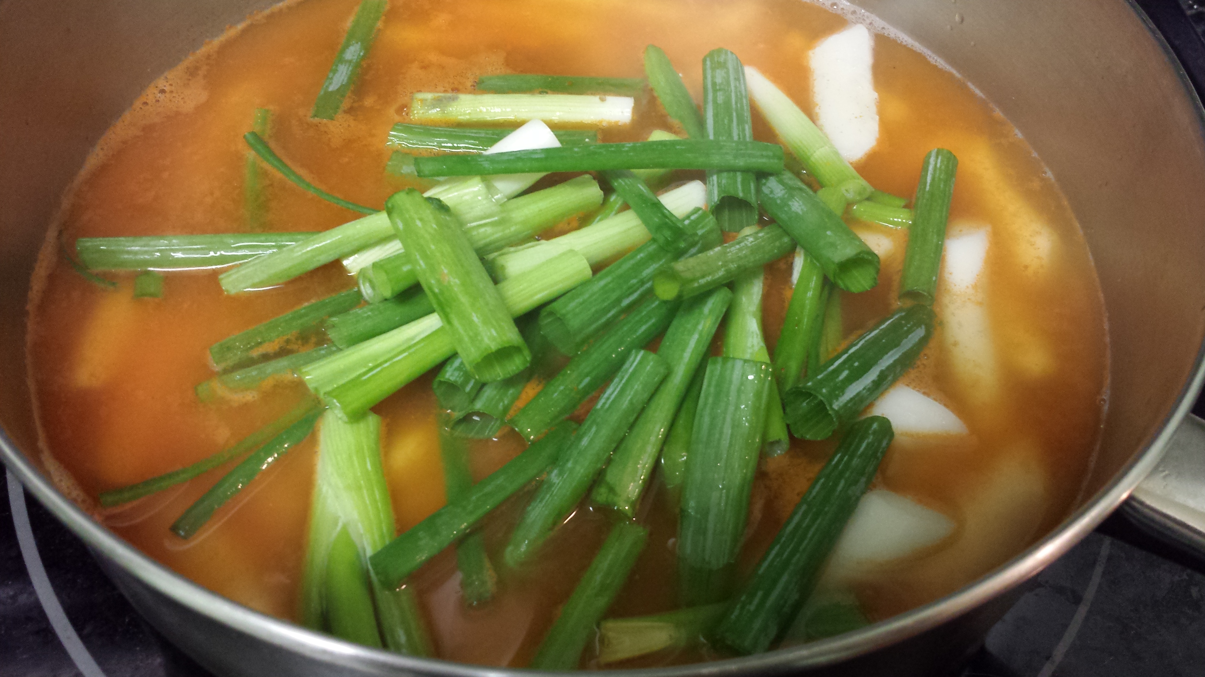 Add the rice cake, paste mixture, and green onion to the stock. Bring this to a boil, stirring gently.