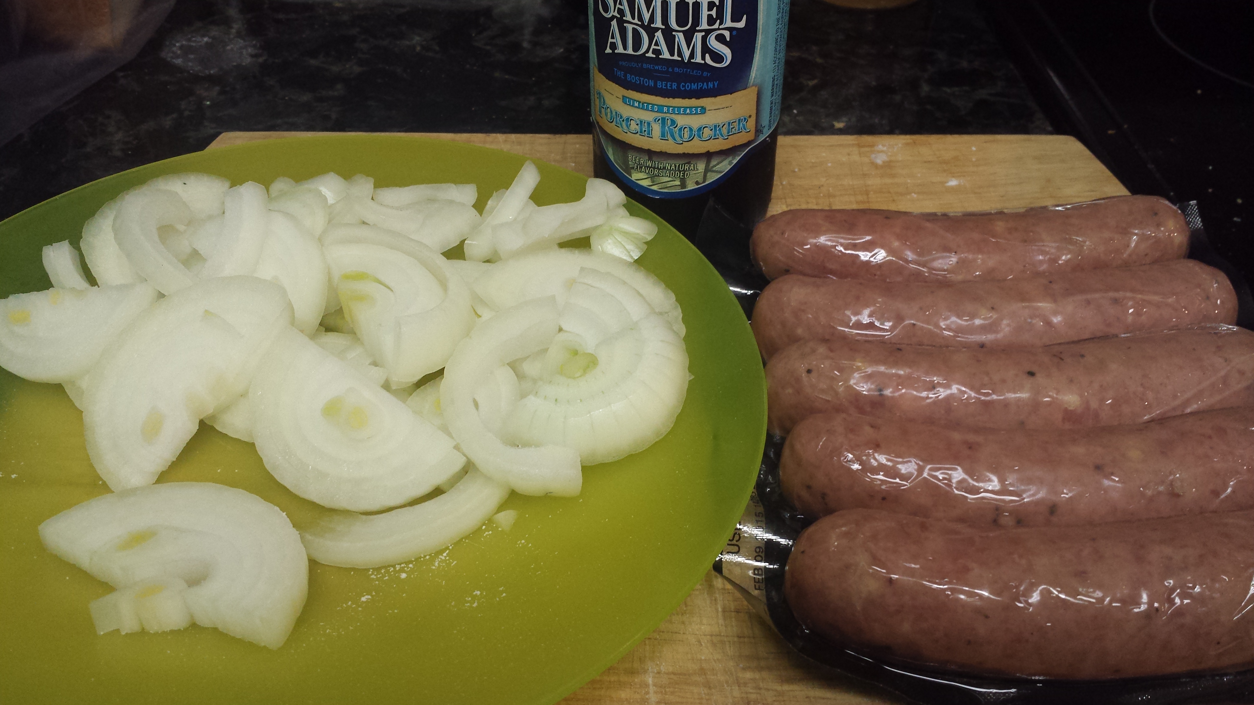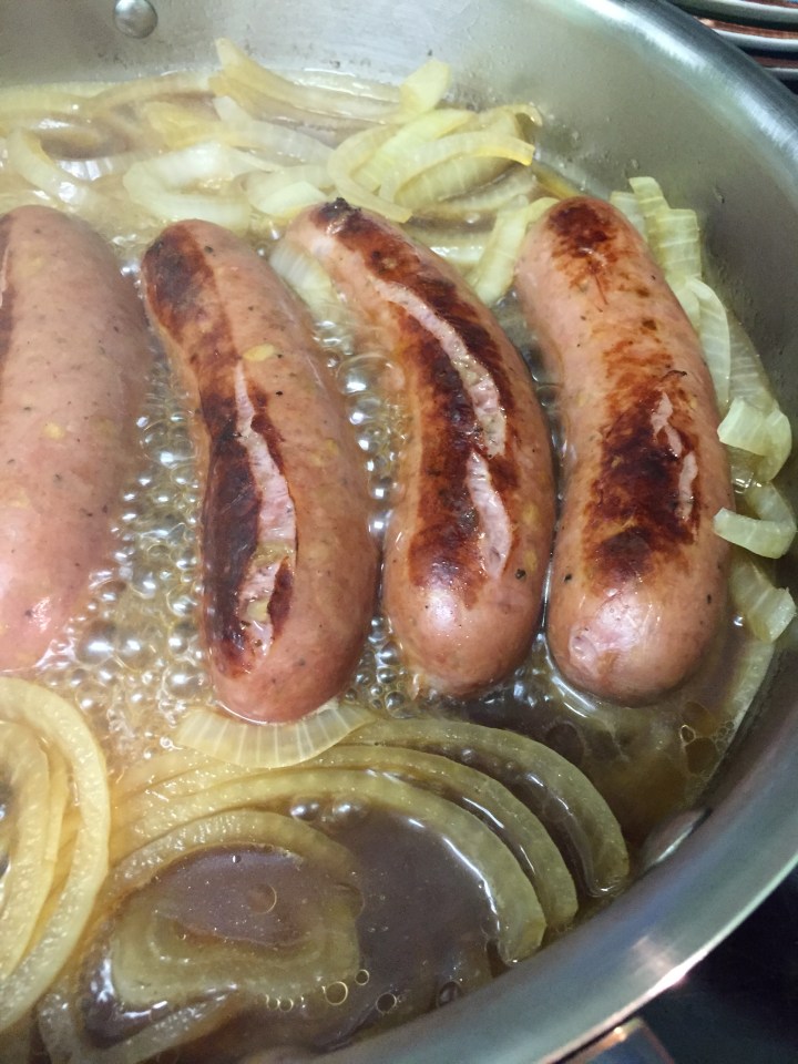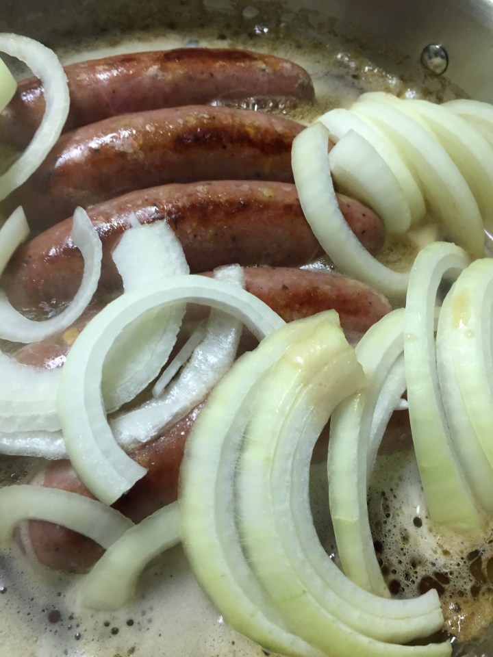 Finally, remove the sausages and stir the onions in the remaining beer. Layer the onions on your brats and serve.