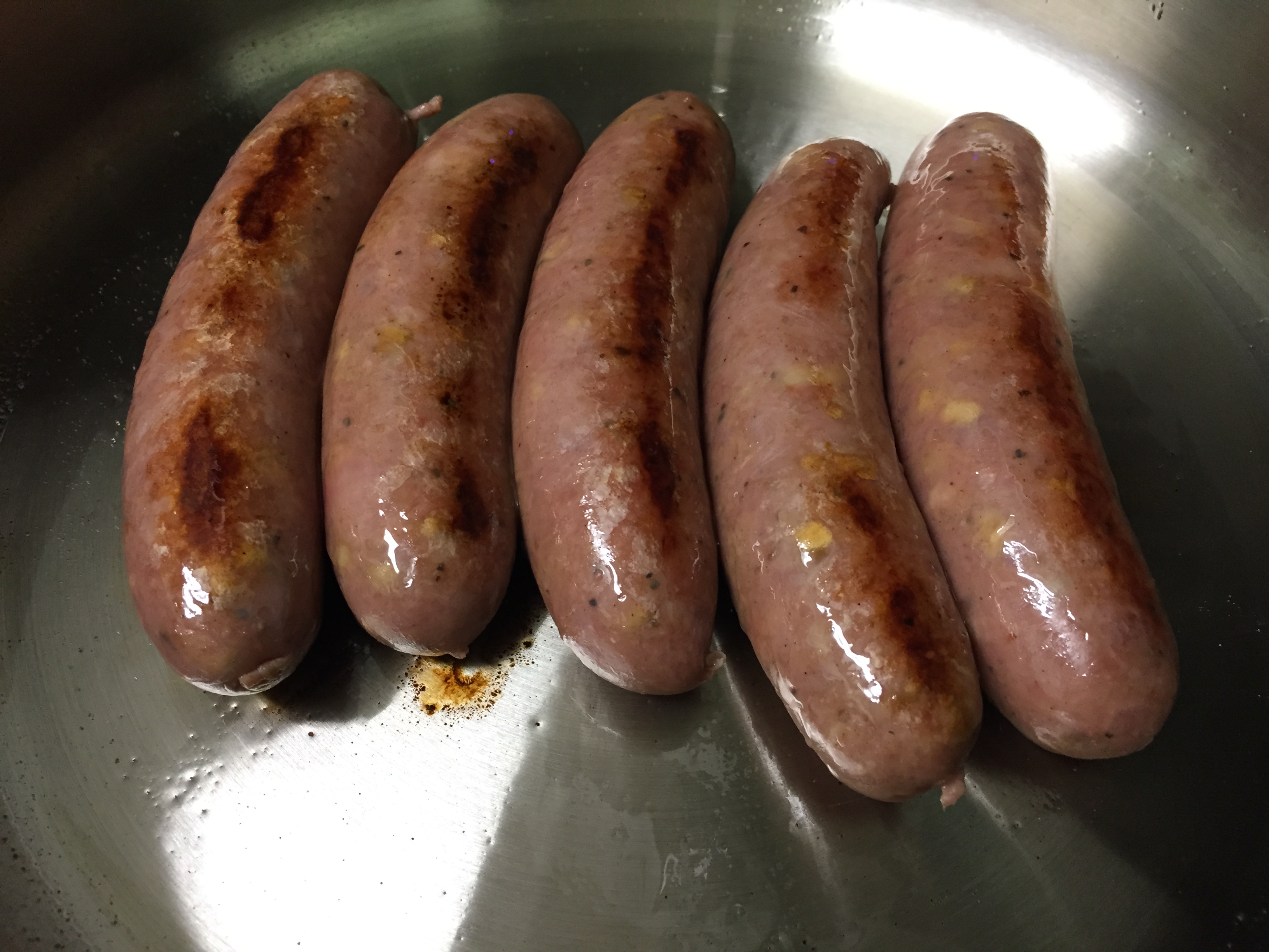 Heat a pan over medium heat; make sure the pan you use has a lid. If your sausages are low fat, like mine, you might want to add a drizzle of oil to the pan; however, this is not required. Brown the sausages on both sides, this should take 2-3 minutes per side as long as your pan is hot.