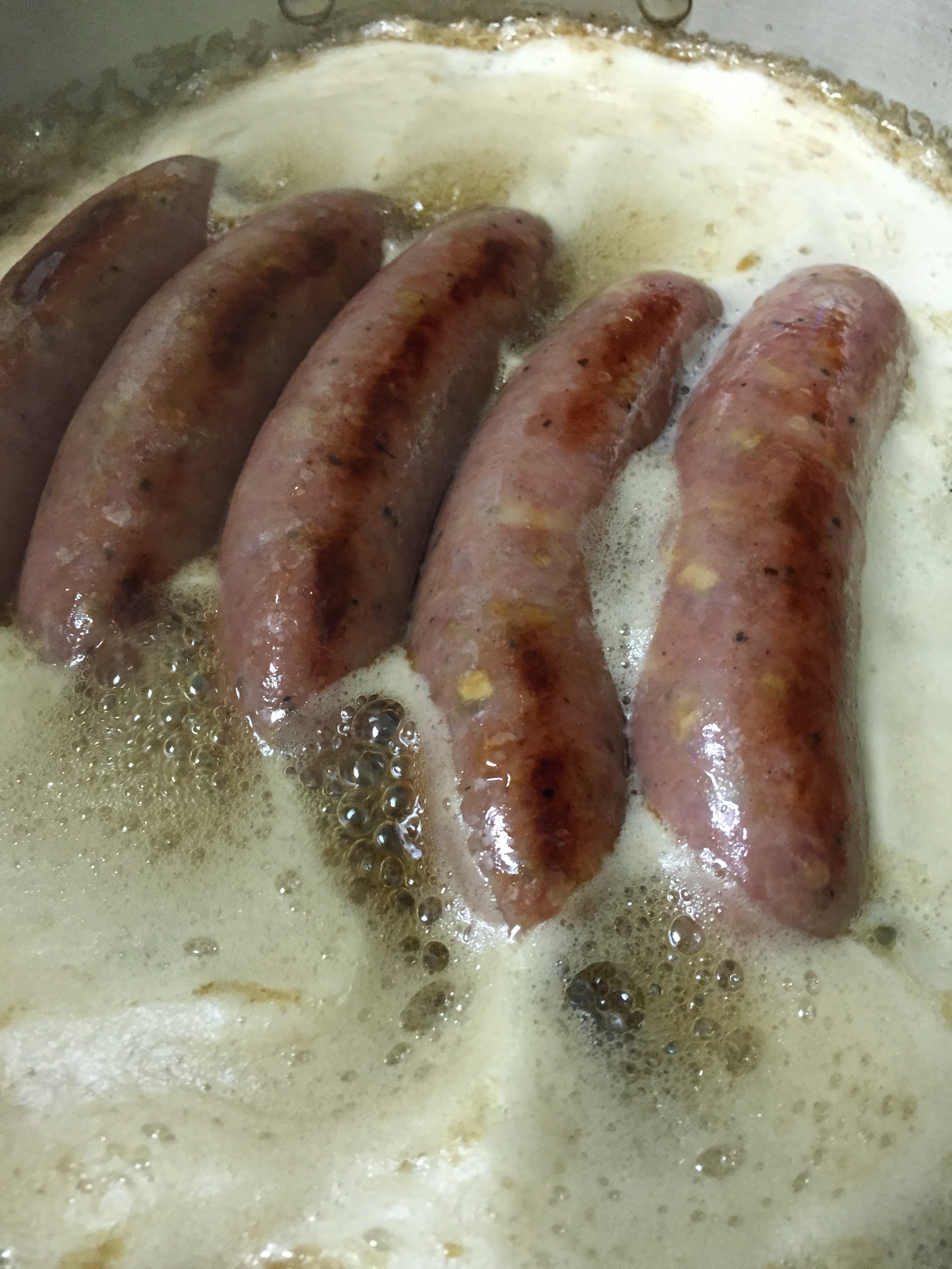 Once the sausages are browned, add the onions and then the beer. You may not need the entire can of beer, it depends on the size of the pan. Pour the beer slowly, as it will foam up fairly significantly. Make sure to fill the pan at least 1/2 inch full of beer, then cover and cook until the beer is gone. This step should take at least 10 minutes. If your sausages aren’t splitting and fully cooked by the end of this process, add more beer and repeat until they are done.
