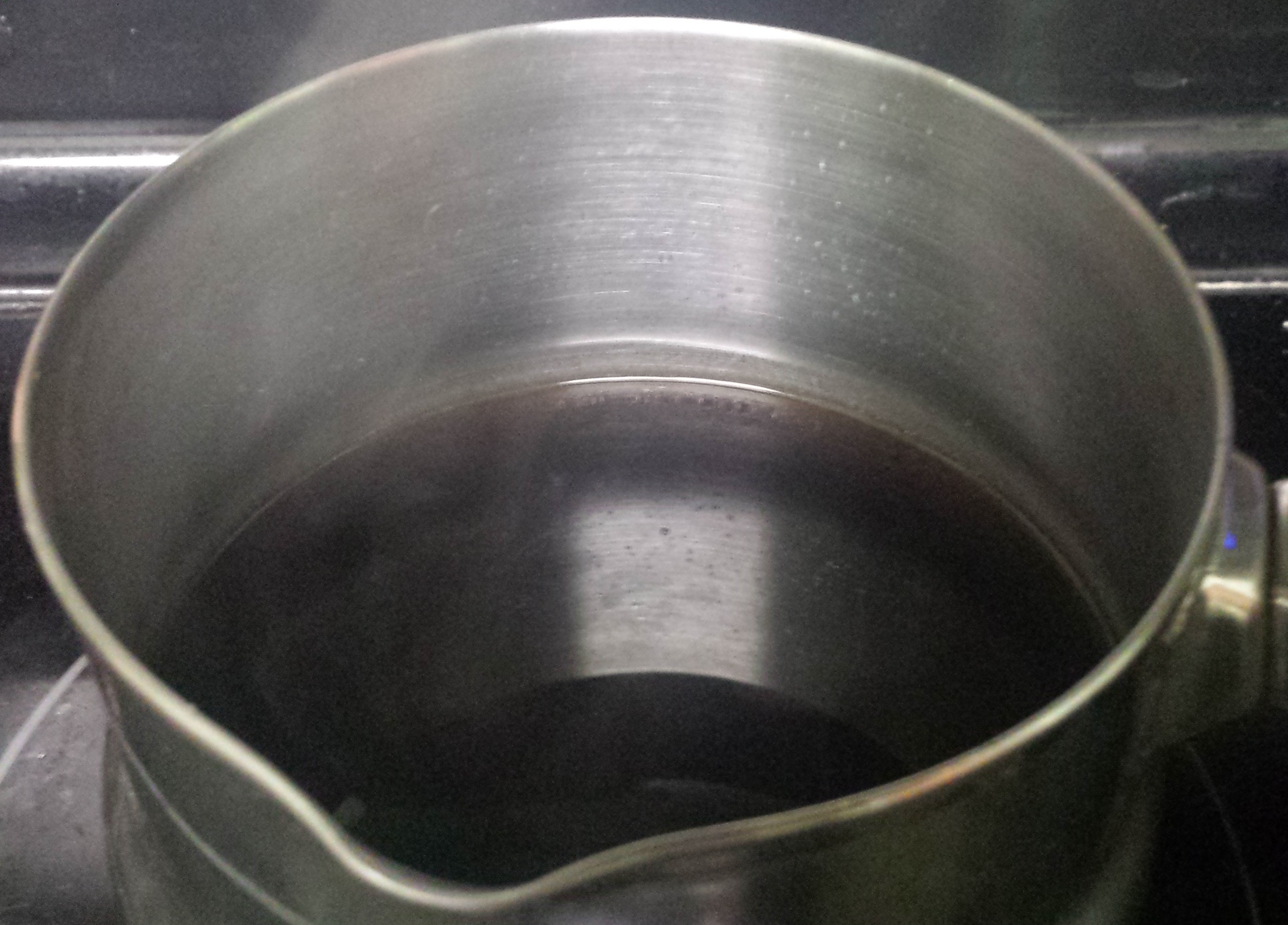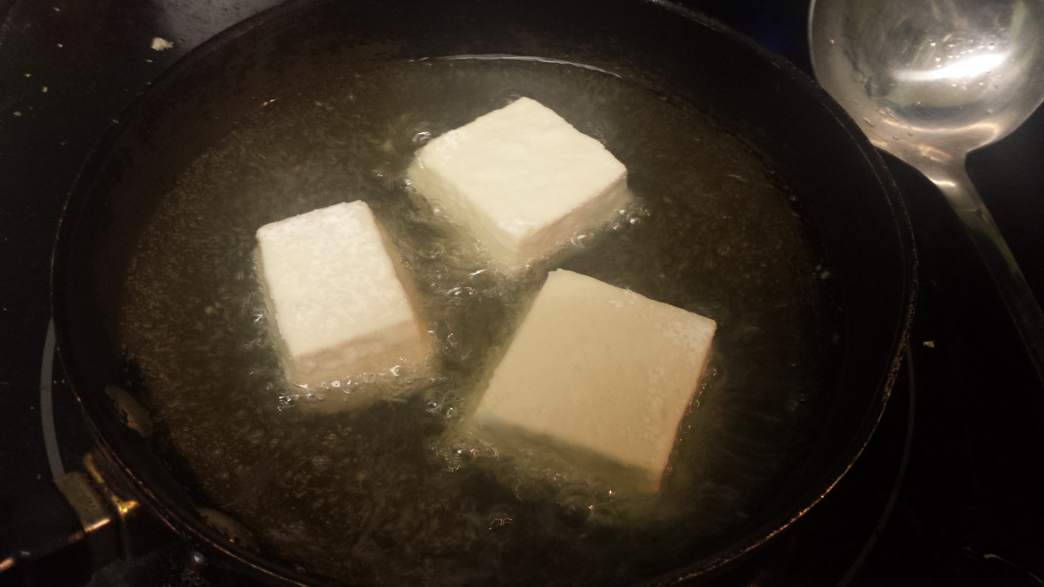Ok, now that everything is ready, let’s fry our tofu. You probably want to start by heating your oil, as this generally takes time. Using a small frying pan with high sides, fill the pan with oil until the oil depth is a little more than 1/4 of the depth of the tofu. We are going to slice the tofu through the middle to make smaller pieces, so this will eventually be about 1/2 the depth of each tofu piece.