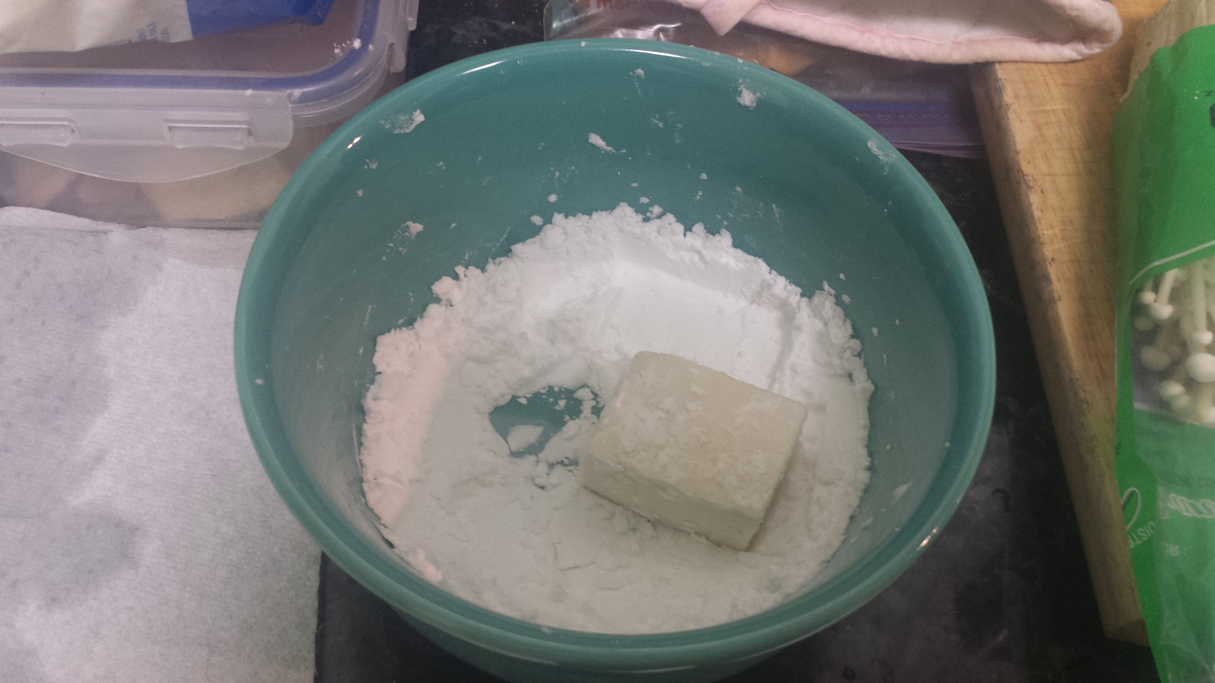 Put 1/2 cup of potato starch into a bowl. You may need more, so keep it handy. Take a piece of tofu and cover it thoroughly in the potato starch. Then, using a finger or pastry brush, wipe off the excess starch (this is important).