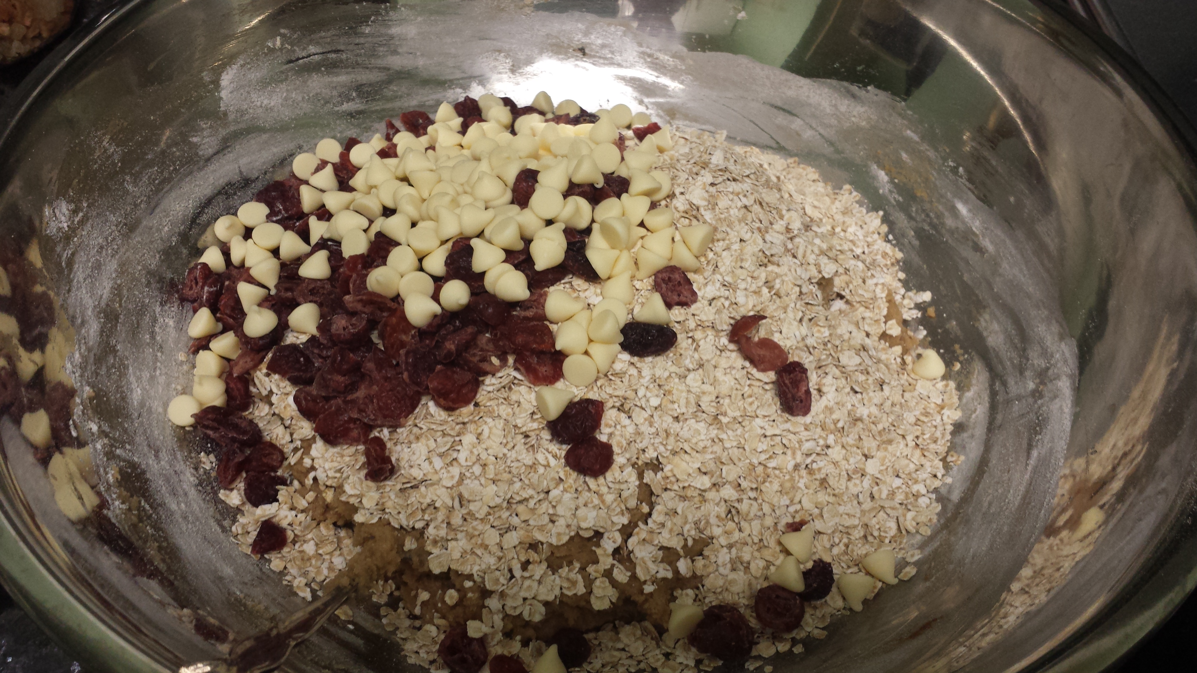 Finally, add the oats, cranberries, and chocolate chips. Again, mix until well combined. I like to use my hands for this part. The dough is so craggy and loose that kneading it together with your hands seems the only way to get it to fully incorporate.