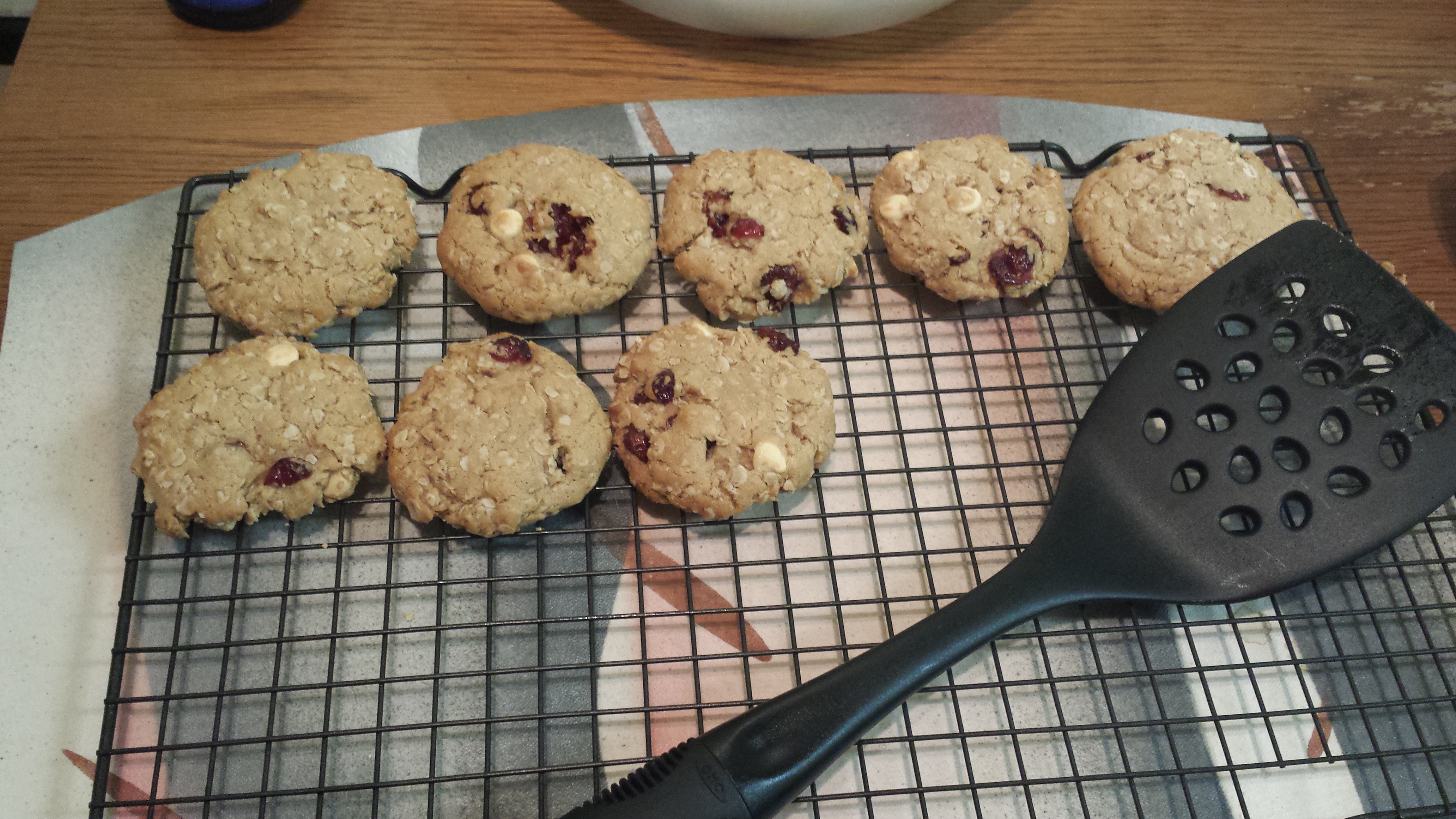 I snagged a simple oatmeal cookie recipe from all recipes which you can view here and then added the appropriate amount of cranberries and white chocolate chips. You can use your favorite oatmeal cookie recipe if you would like; this works with any recipe. Finally, if any of you have your own variations you would like me to try and review, please post them in the comments!