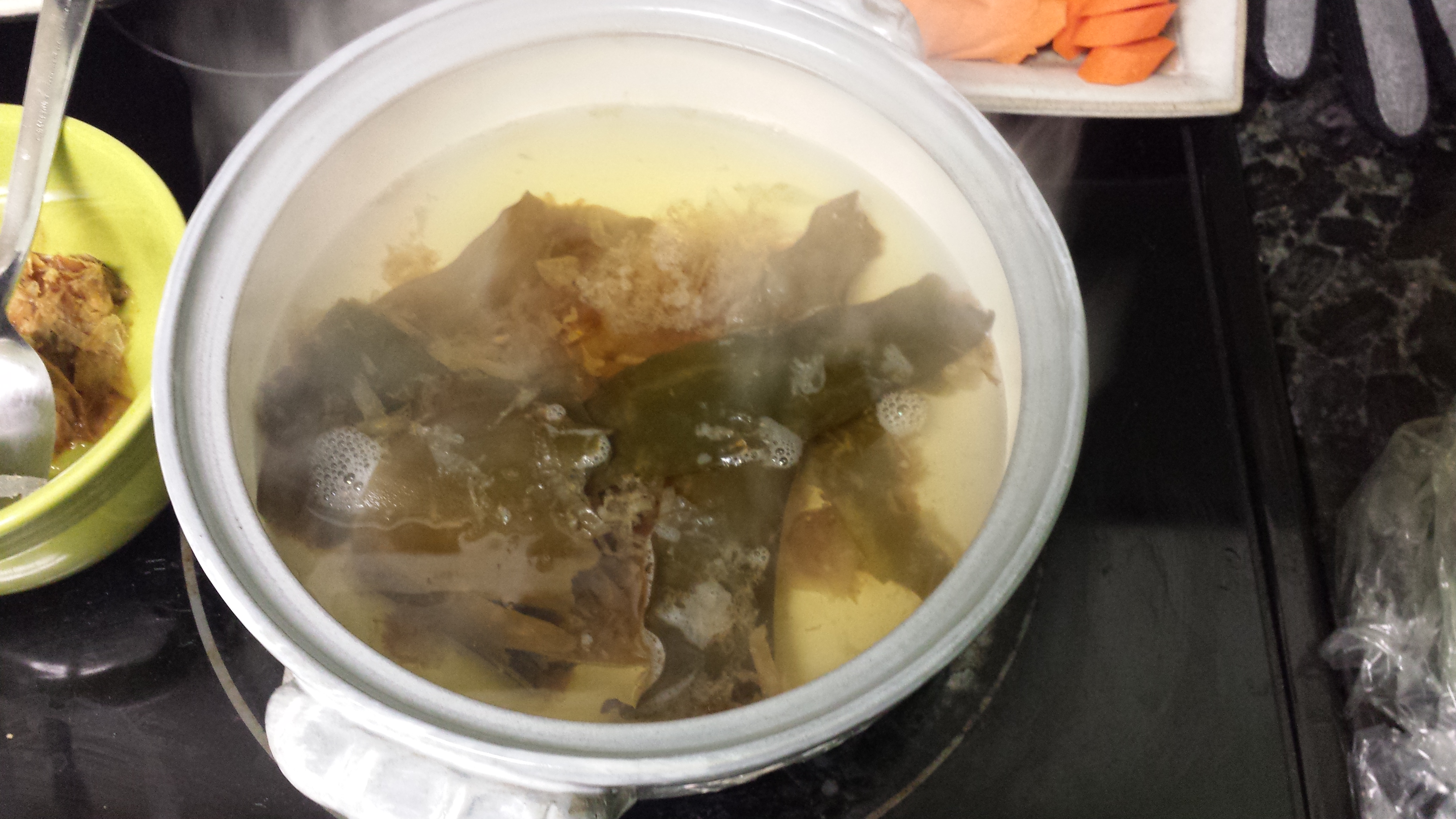 When your broth is ready, remove the bonito flakes and konbu. If you would like, you can cut the konbu into small pieces and add it to your other ingredients; it’s tasty!