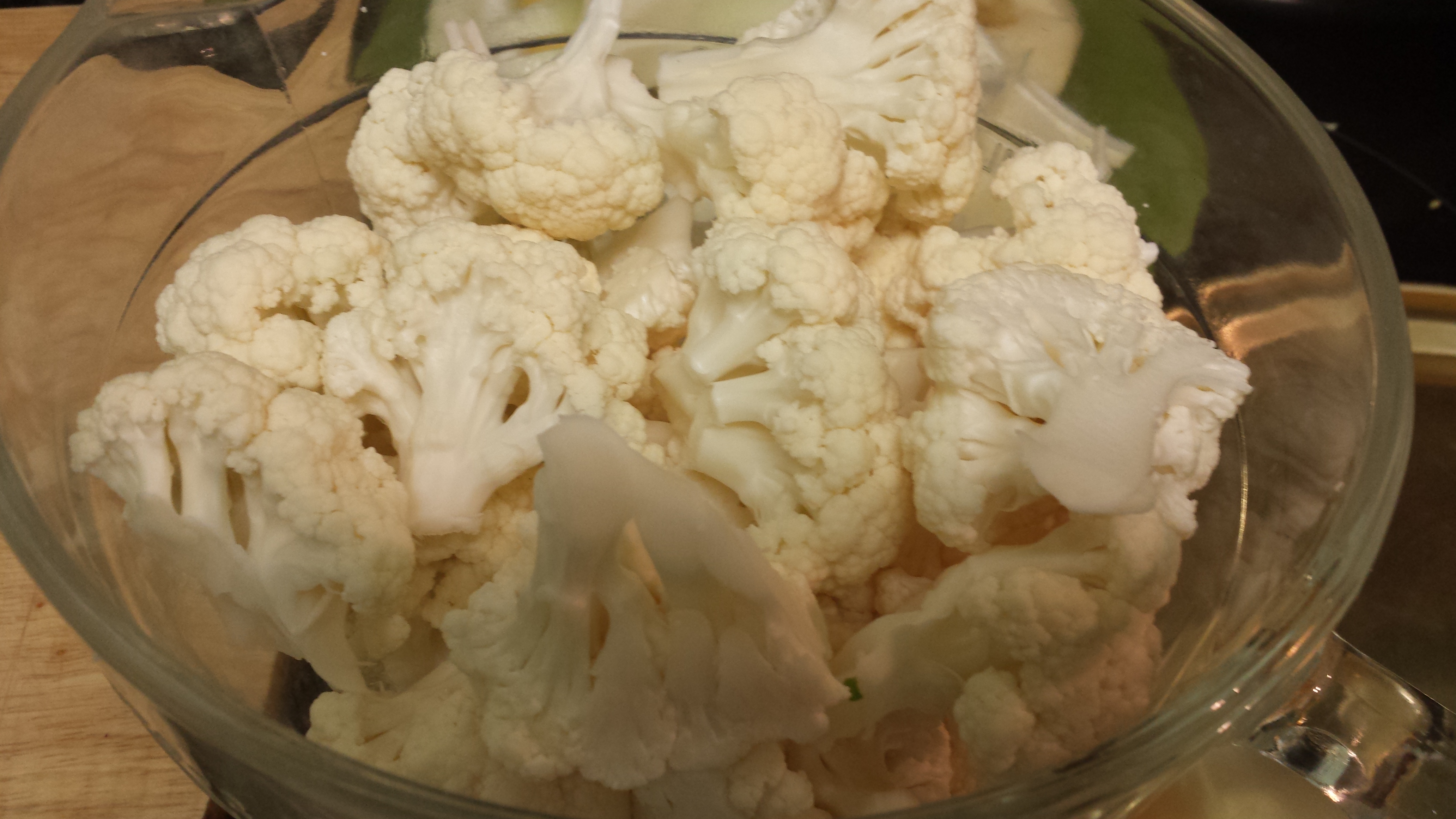 Next, cut the cauliflower into bite-sized pieces by cutting the florets off the stem. You just want the white bits, no leaves or anything.