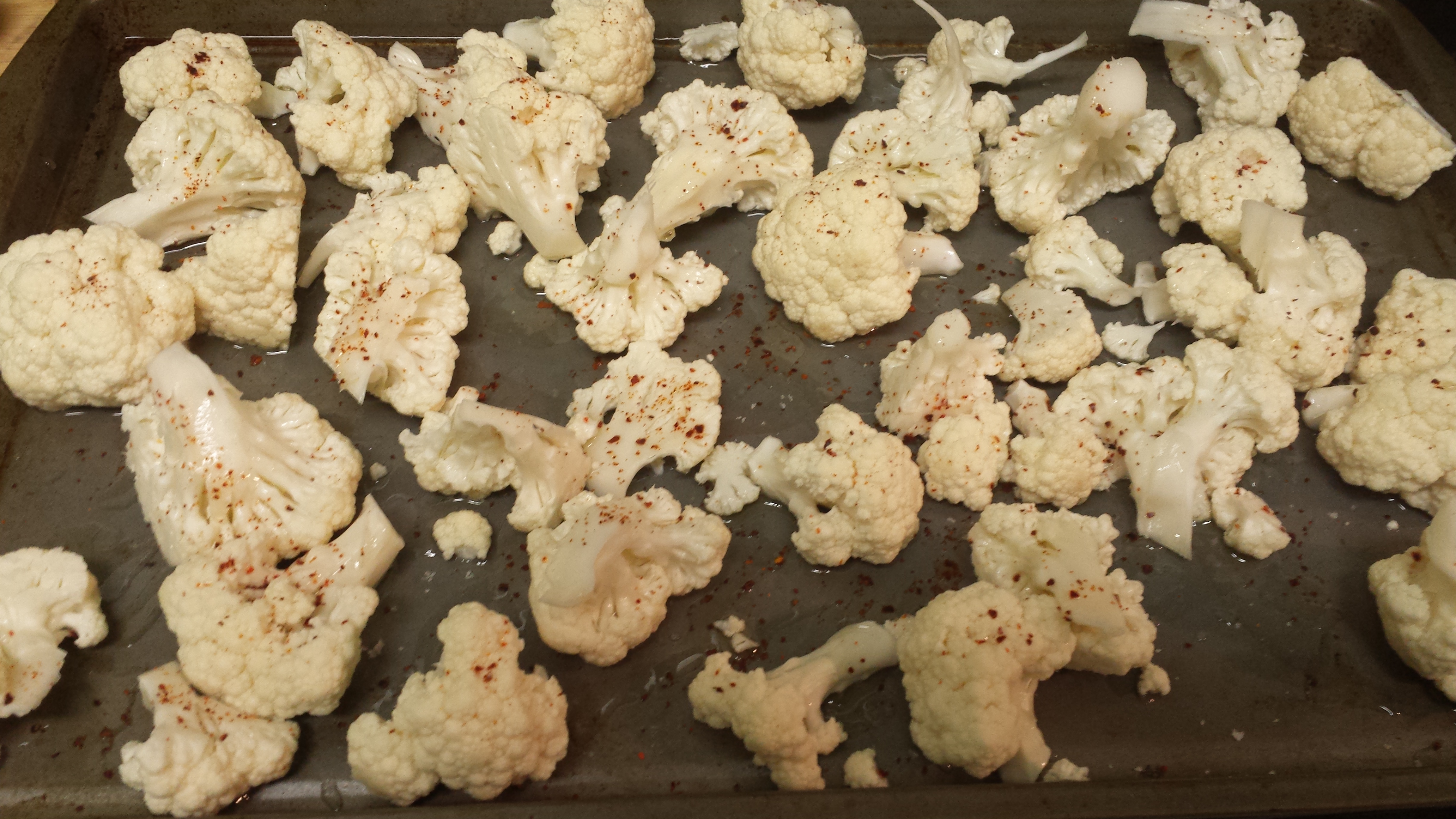 Put the cauliflower in a large bowl and add the salt, olive oil, and red pepper. Mix thoroughly until fully coated, you can add more olive oil if necessary. The cauliflower should appear glossy, but not be dripping with oil.
